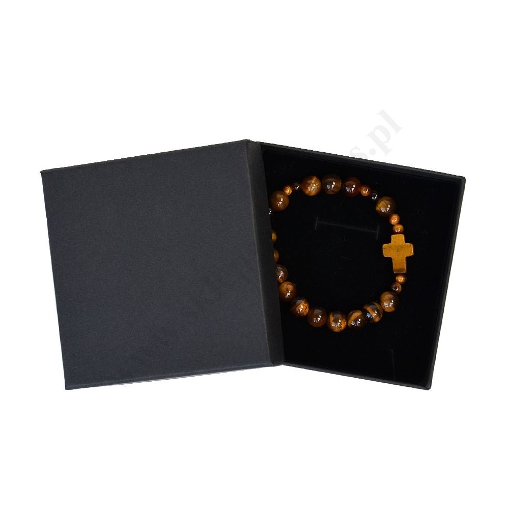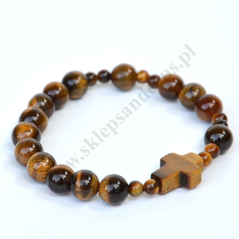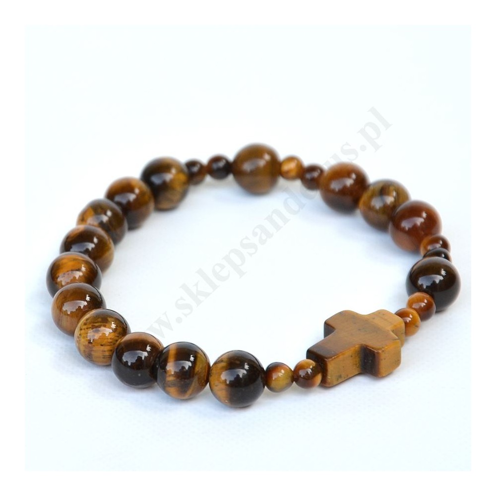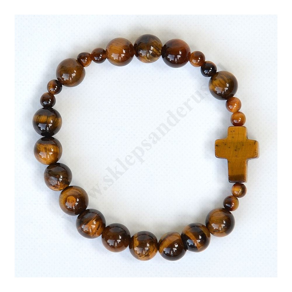 Dziesiątek różańca w postaci bransoletki na rękę wykonanej z kamienia naturalnego tygrysie oko i elastycznego szurka. Średnica koralika ok. 8 mm.