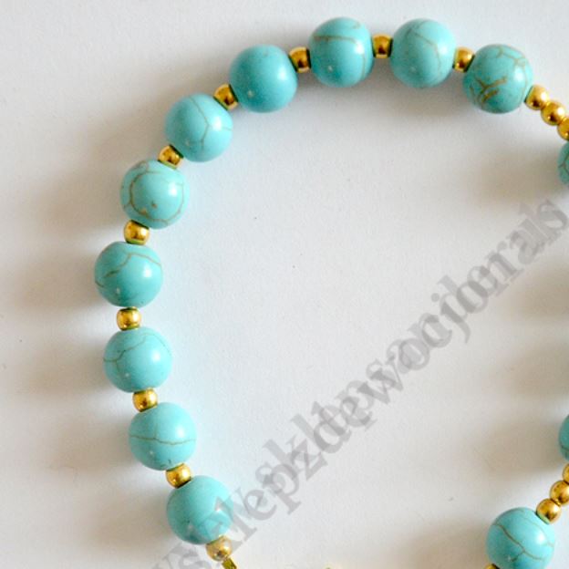 Dziesiątka różańca w postaci zapinanej bransoletki na rękę wykonanej na metalowej lince, koraliki wykonane z kamienia naturalnego - turkus, średnica koralika ok. 8 cm.