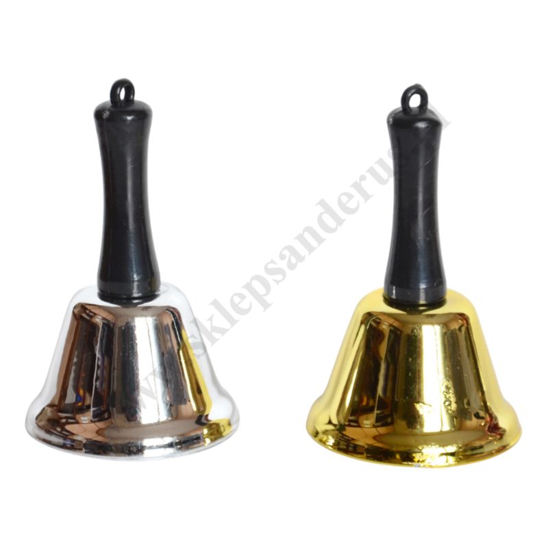 Dzownek metalwy z rączką z tworzywa sztucznego. Wysokość dzwonka 6.5 cm, szerokość 3.8 cm, dostępny w dwóch kolorach srebrnym lub złotym.