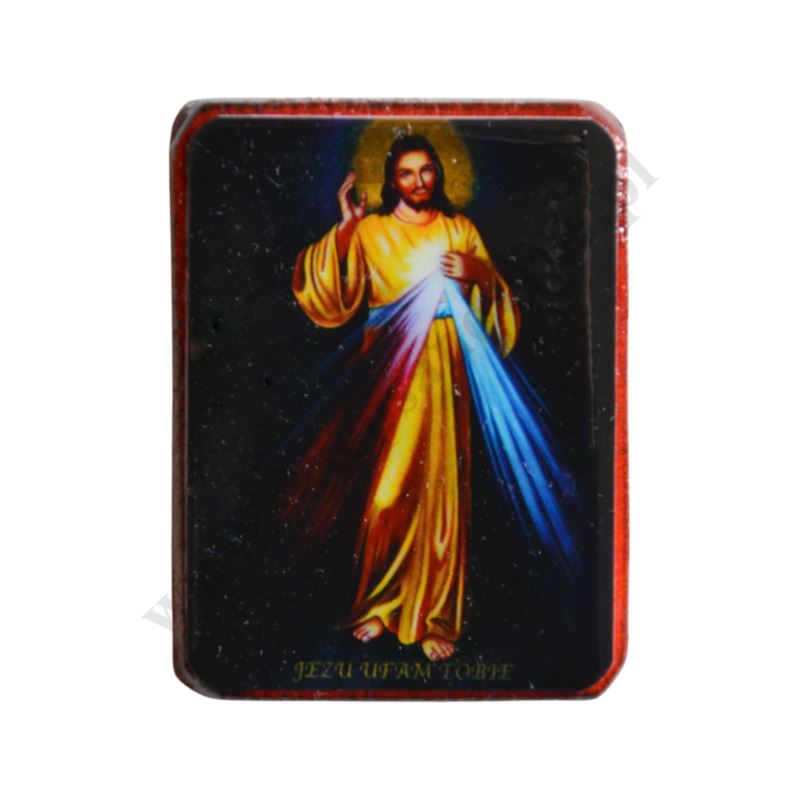 Magnes na drewienku w formacie 3.8 x 5 cm przedstawiający wizerunek Jezu Ufam Tobie.