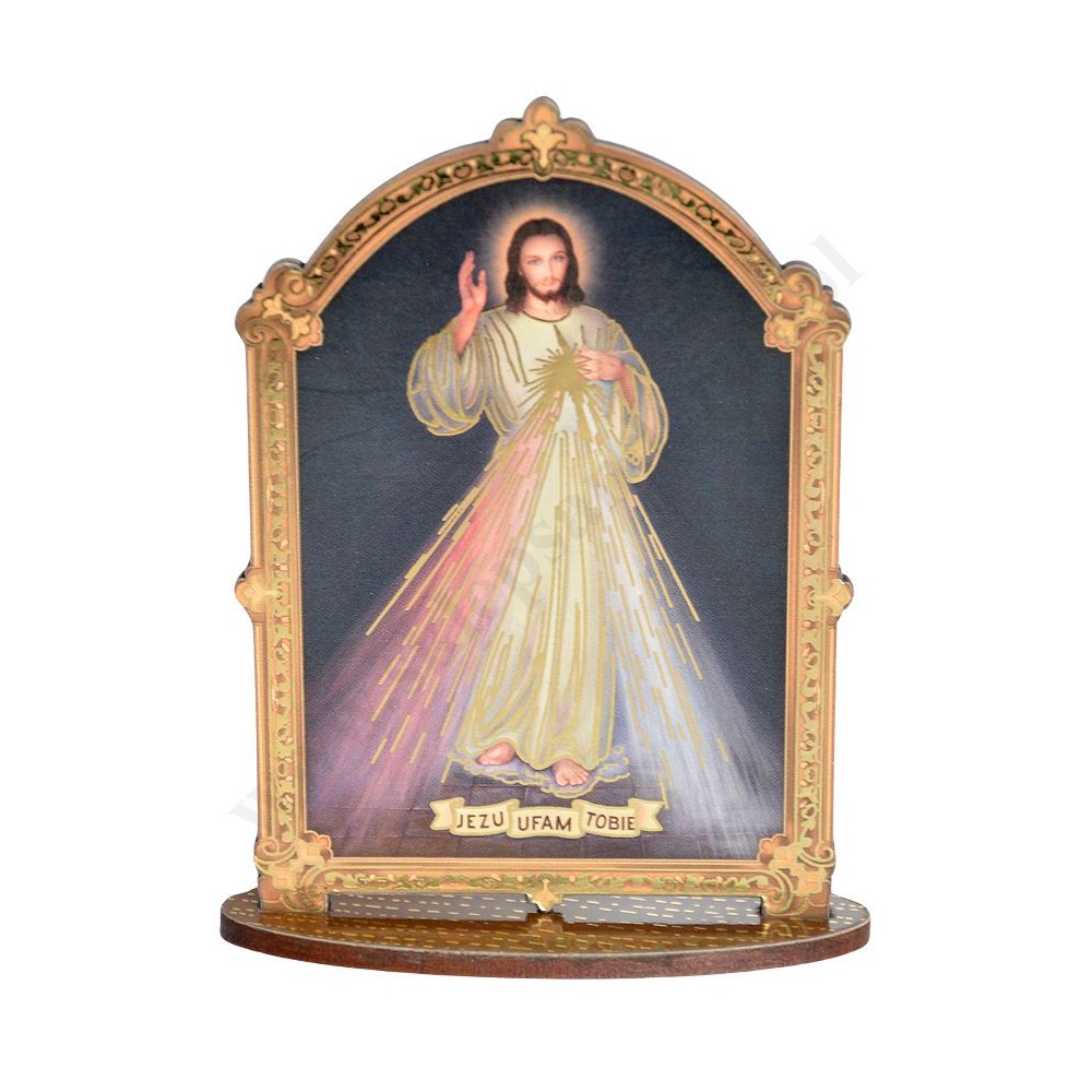 Statuetka Jezu Ufam Tobie wykonana ze sklejki o wysokości 10.3 cm i szerokości 8 cm.