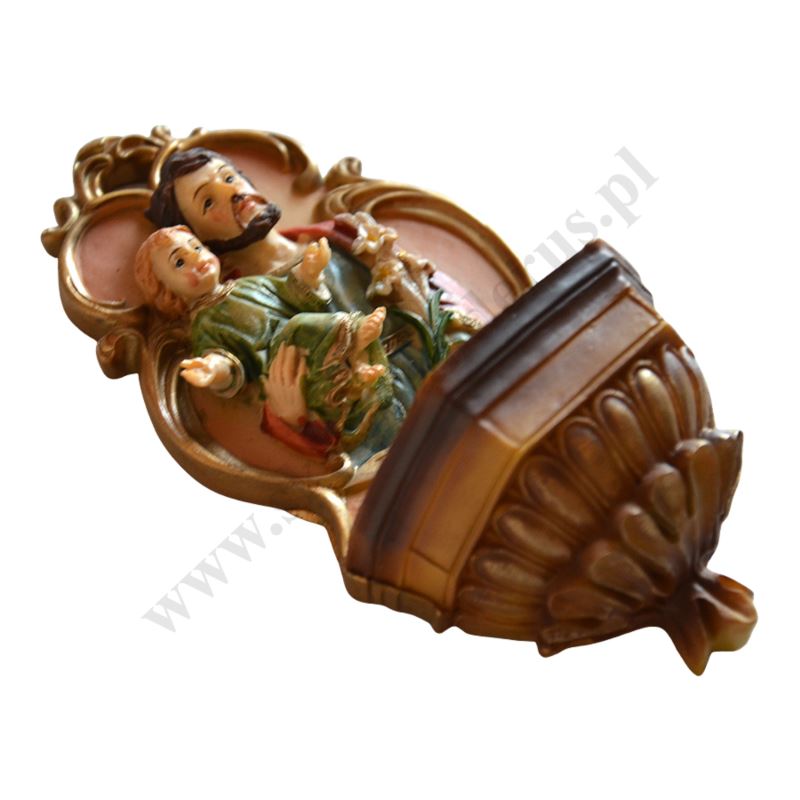 Kropielnica wykonana z żywicy przedstawiająca wizerunek Świętego Józefa. Wyokość kropielnicy 13 cm, szerokość 6.3 cm.