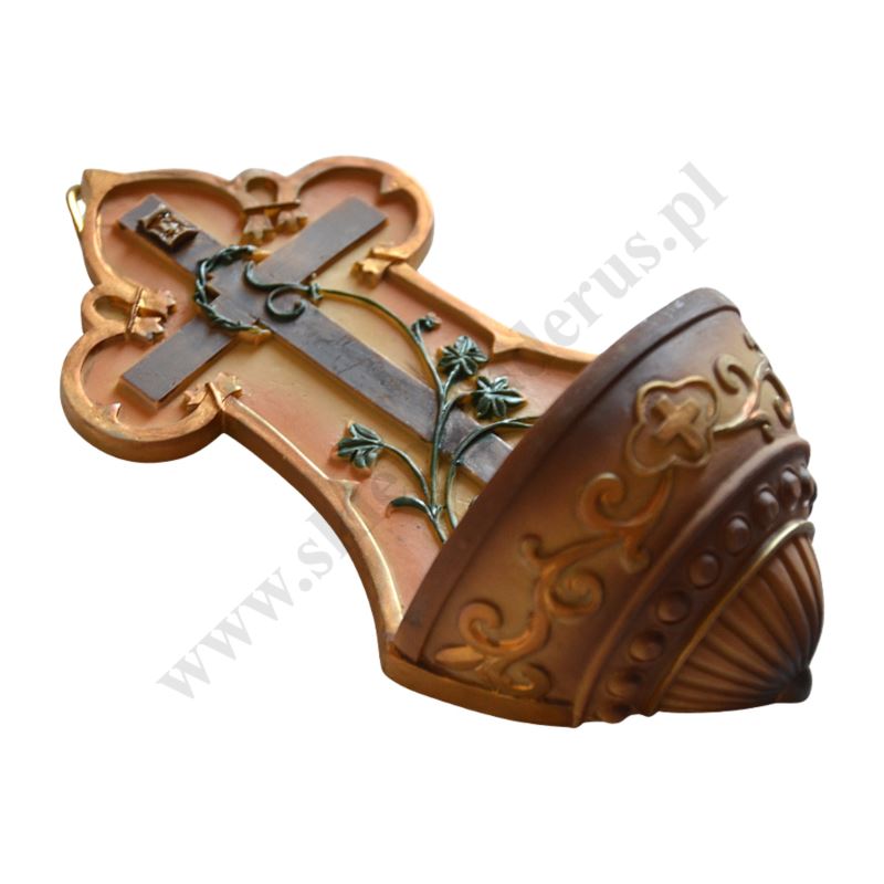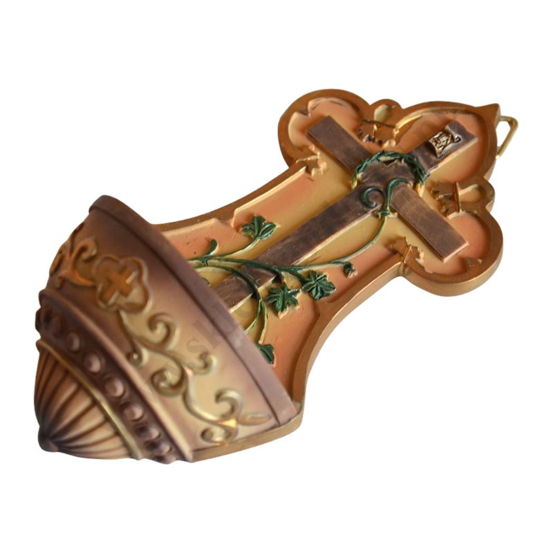 Kropielnica wykonana z żywicy przedstawiająca wizerunek krzyża. Wyokość kropielnicy 13.7 cm, szerokość 7 cm.