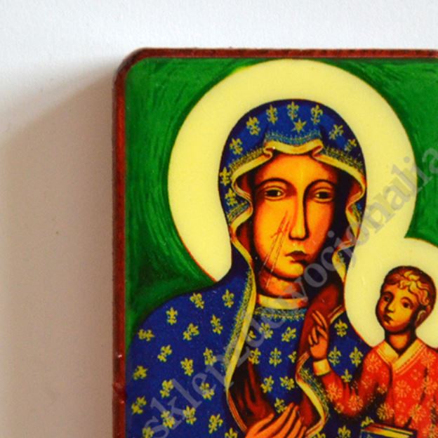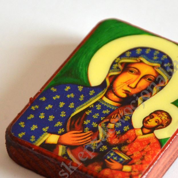 Magnes przedstawiający wizerunek Matki Bożej Częstochowskiej w rozmiarze 4 x 5 cm.