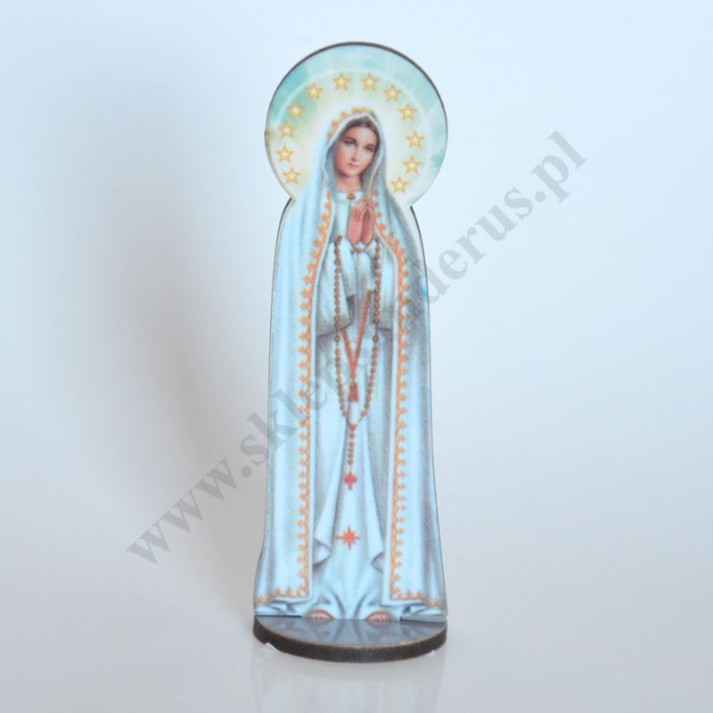 Statuetka Matki Bożej Fatimskiej wykonana w pleksji. Wysokość statuetki 9.3 cm, szerokość podstawy 3 cm, głębokość podstawy 3 cm