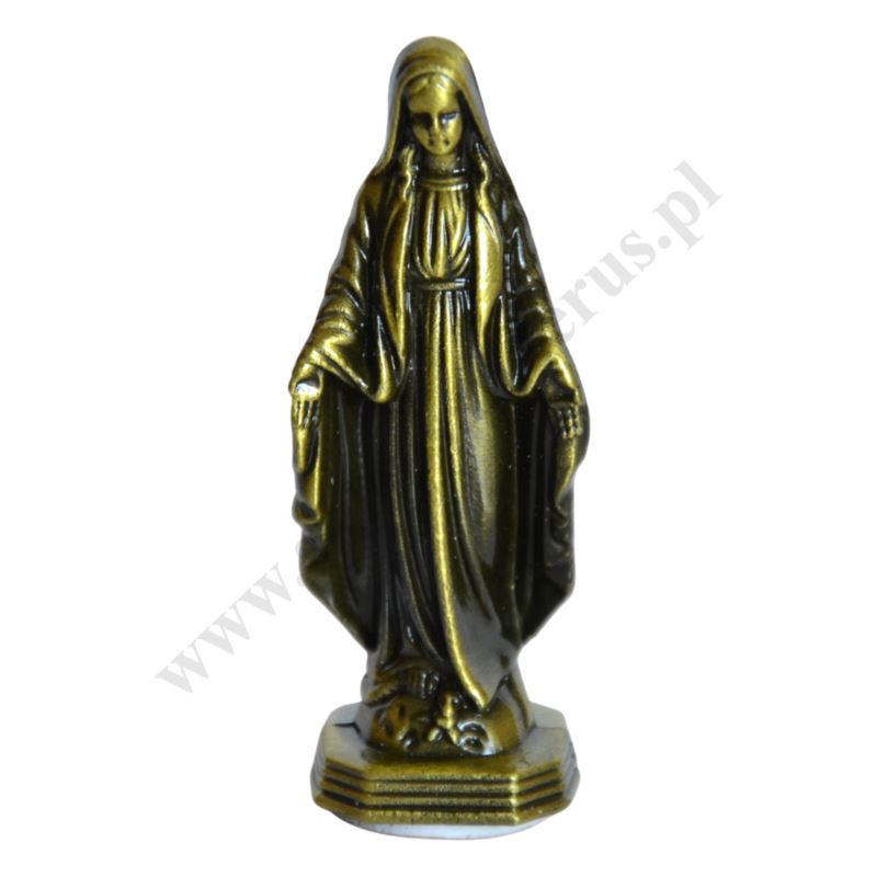 Metalowa figurka przylepiec Matki Bożej Niepokalanej o wysokości 6.3 cm i szerokości 2.3 cm.