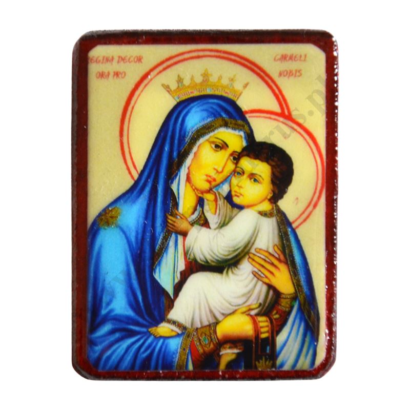 Magnes na drewienku w formacie 3.8 x 5 cm przedstawiający Matkę Bożą Szkaplerzną.