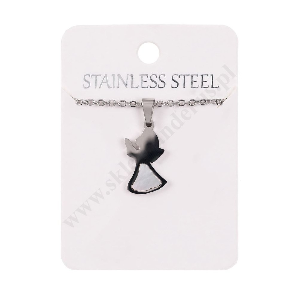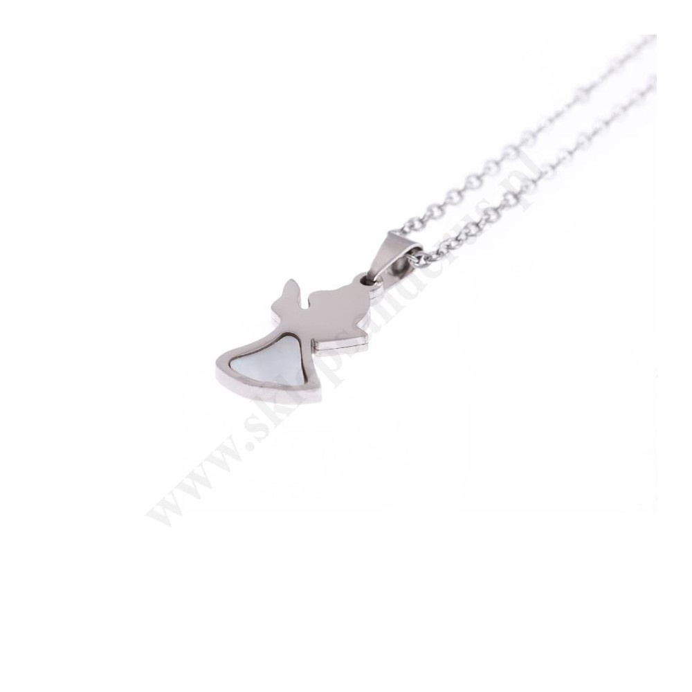 Aniołek na łańcuszku wykonane z masy perłowej i metalu, łańcuszek wykonany ze stali szlachetnej. Wysokość aniołka 2.2 cm, długość łańcuszka 55 cm.