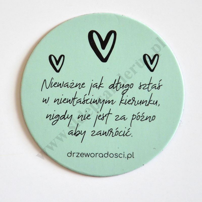 Magnes z napisem "Nieważne jak długo szłaś w niewłaściwym kierunku, nigdy nie jest za późno aby zawrócić" o średnicy 6 cm.