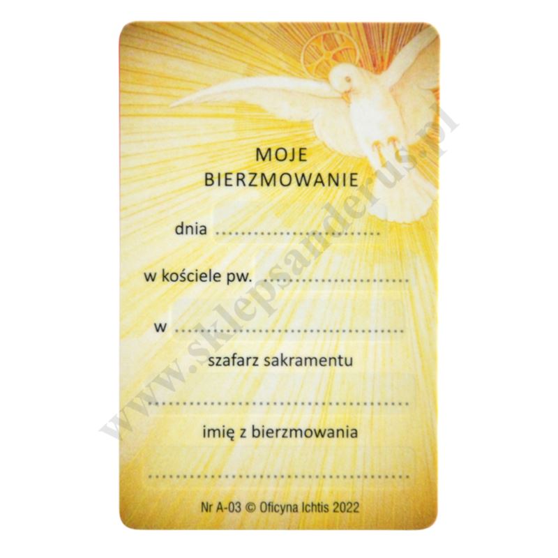 Pamiątka bierzmowania w postaci biznes karty w formacie 5.4 x 8.5 cm.