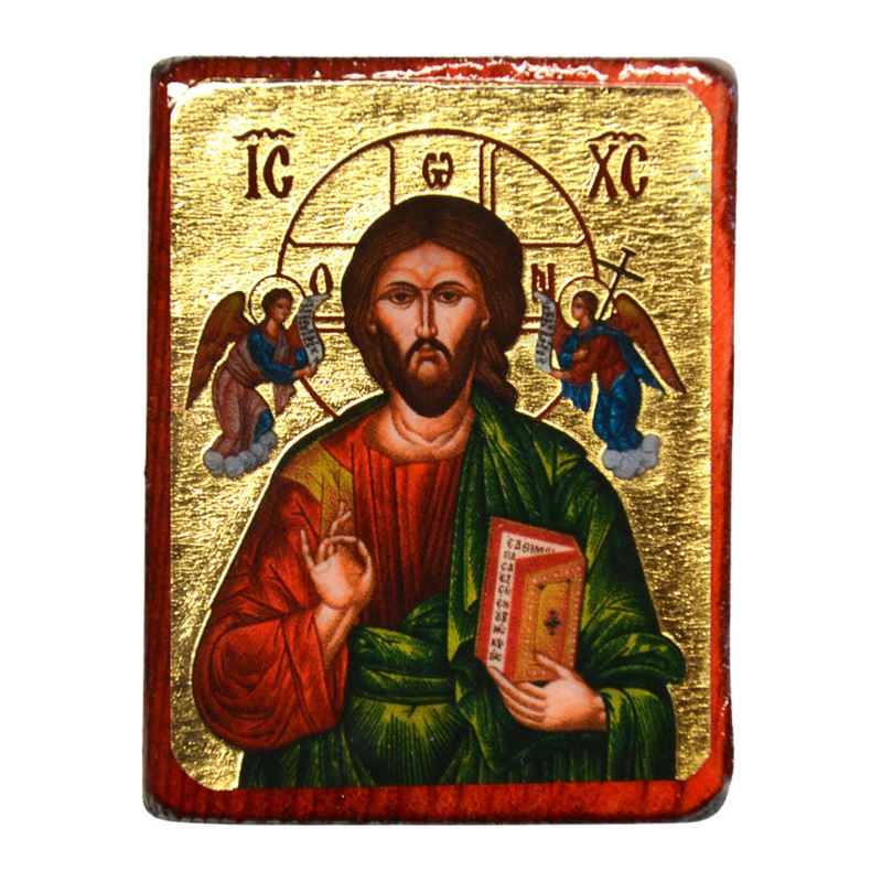 Magnes na drewienku w formacie 3.8 x 5 cm przedstawiający wizerunek Pana Jezusa Pantokratora.