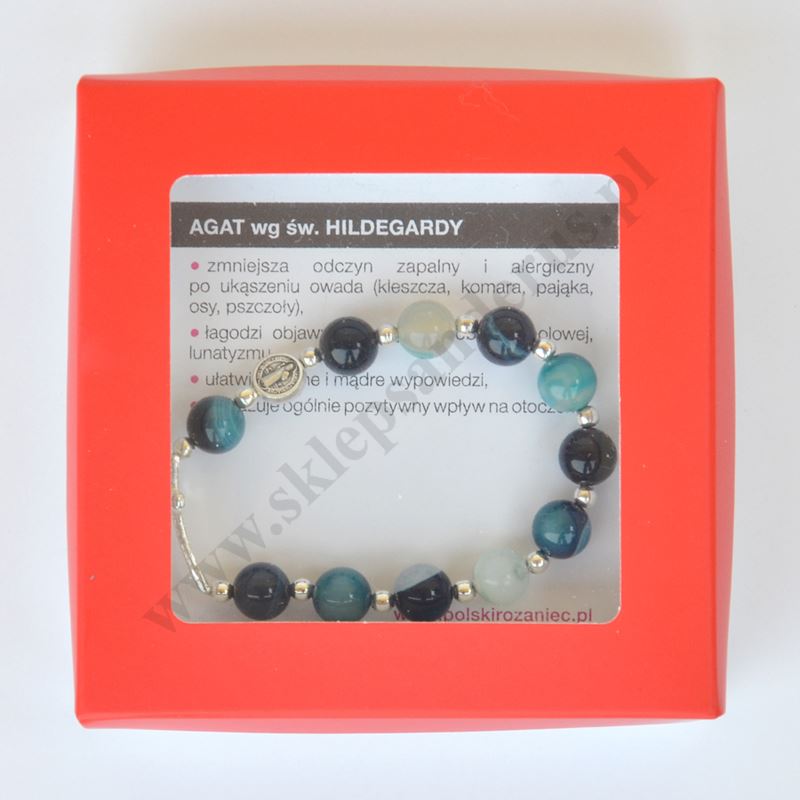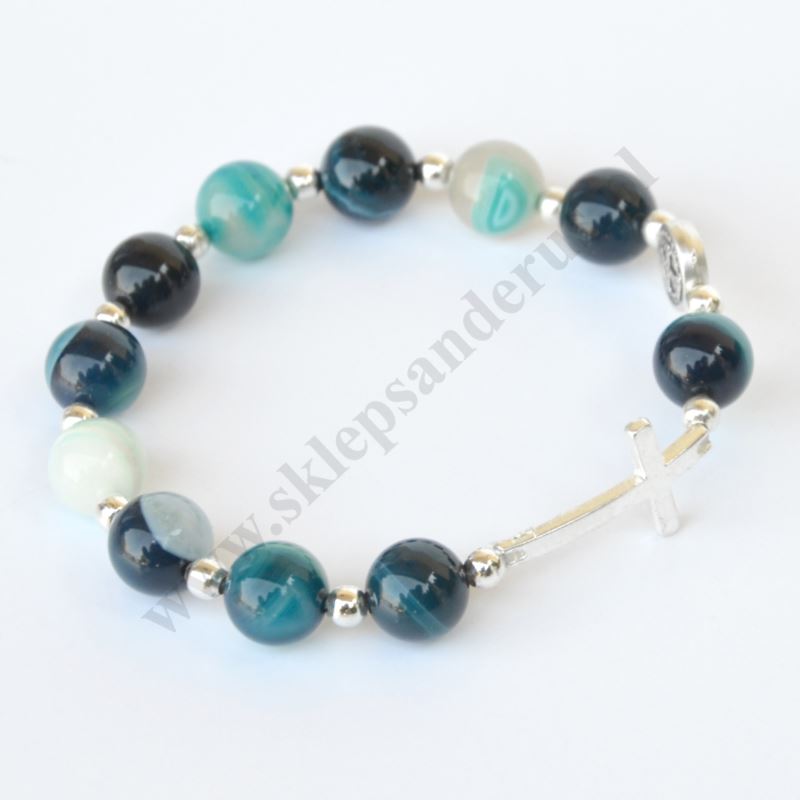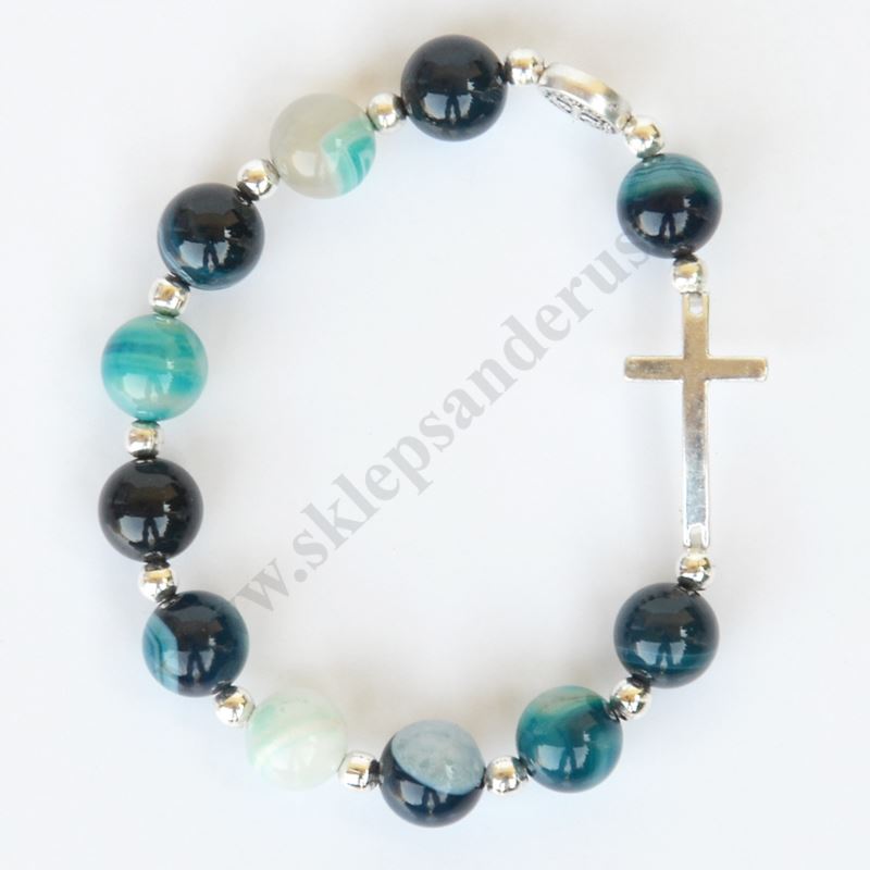 Różaniec bransoletka wykonana z półszlachetnego obrabianego kamienia agatu mosrkiego o średnicy koralika 10 mm.