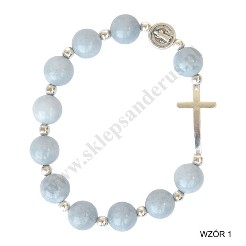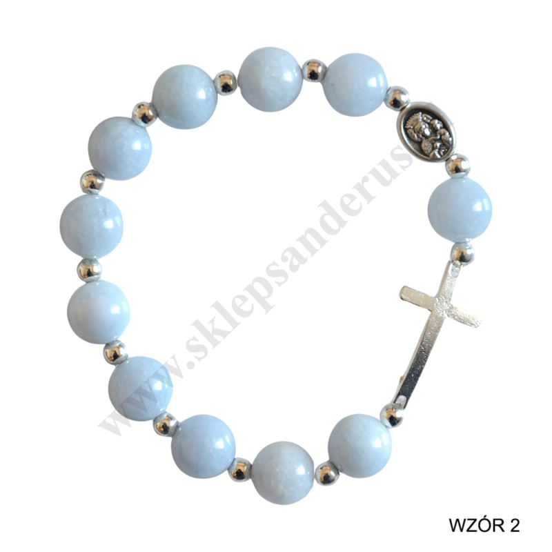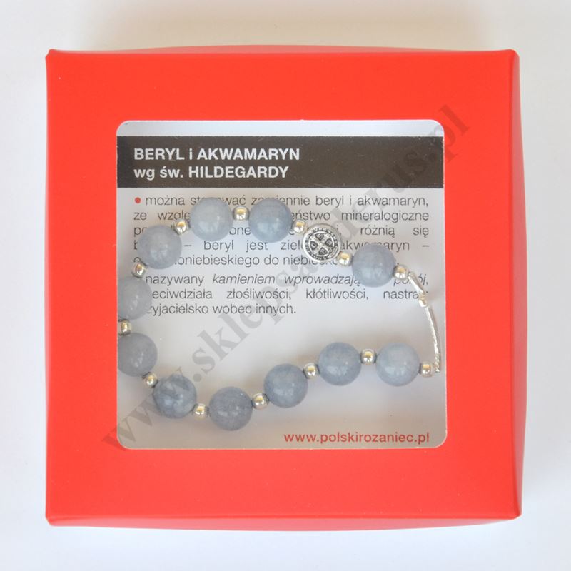 Różaniec bransoletka wykonana z półszlachetnego obrabianego kamienia Beryl i Akwamaryn o średnicy koralika 10 mm. Dwa wzory, różniące się medalikiem.