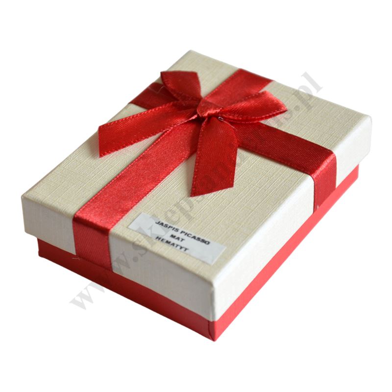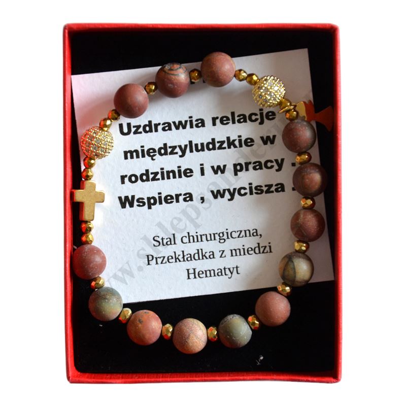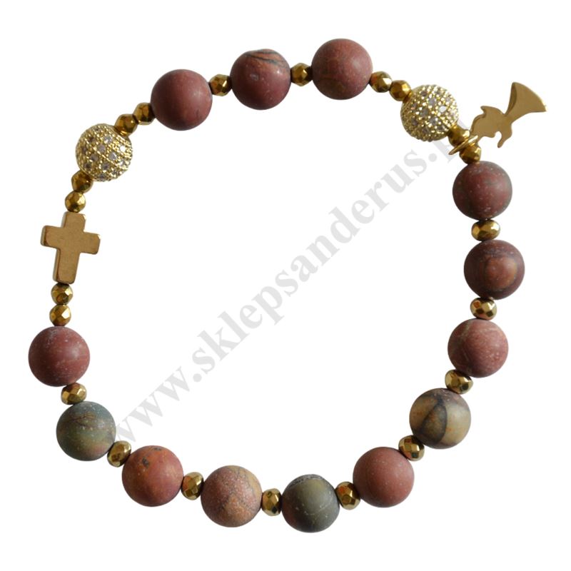 Różaniec w postaci bransoletki na rękę wykonanej z kamienia półszlachetnego jaspis picasso w prezentowym pudełeczku.