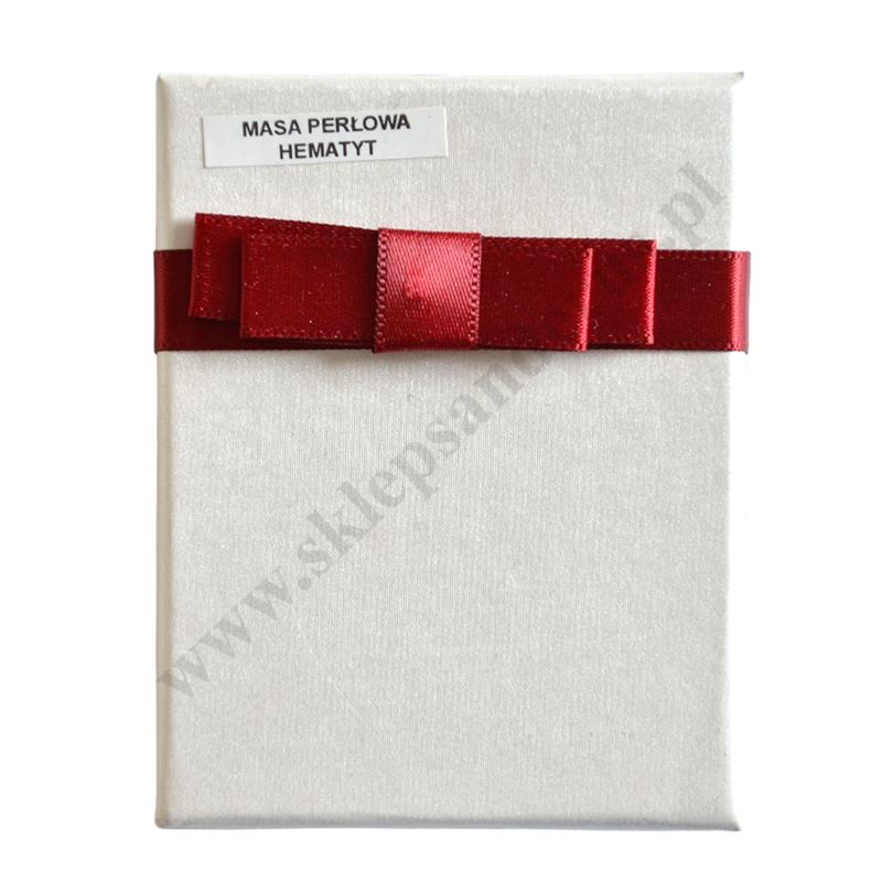Różaniec w postaci bransoletki na rękę wykonanej z masy perłowej i hematytu w prezentowym pudełeczku.