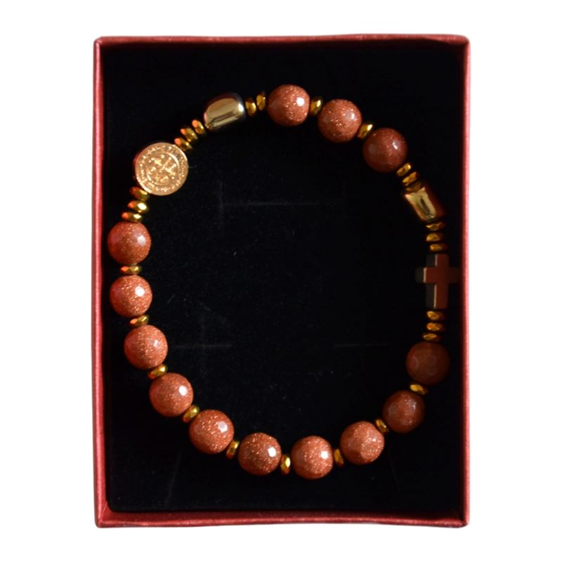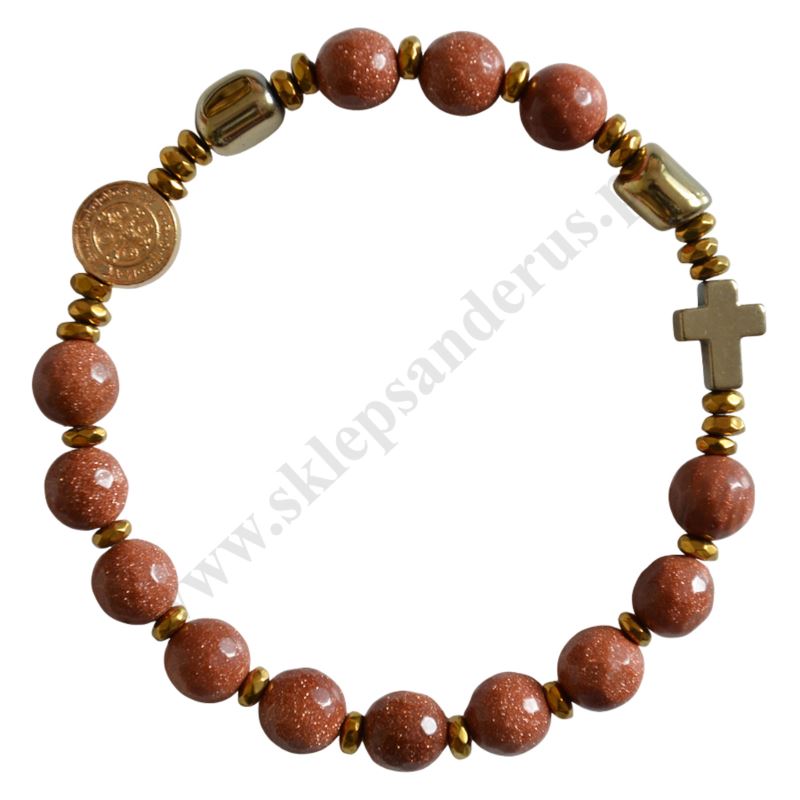 Różaniec w postaci bransoletki na rękę wykonanej z kamienia półszlachetnego piasek pustyni w prezentowym pudełeczku.
