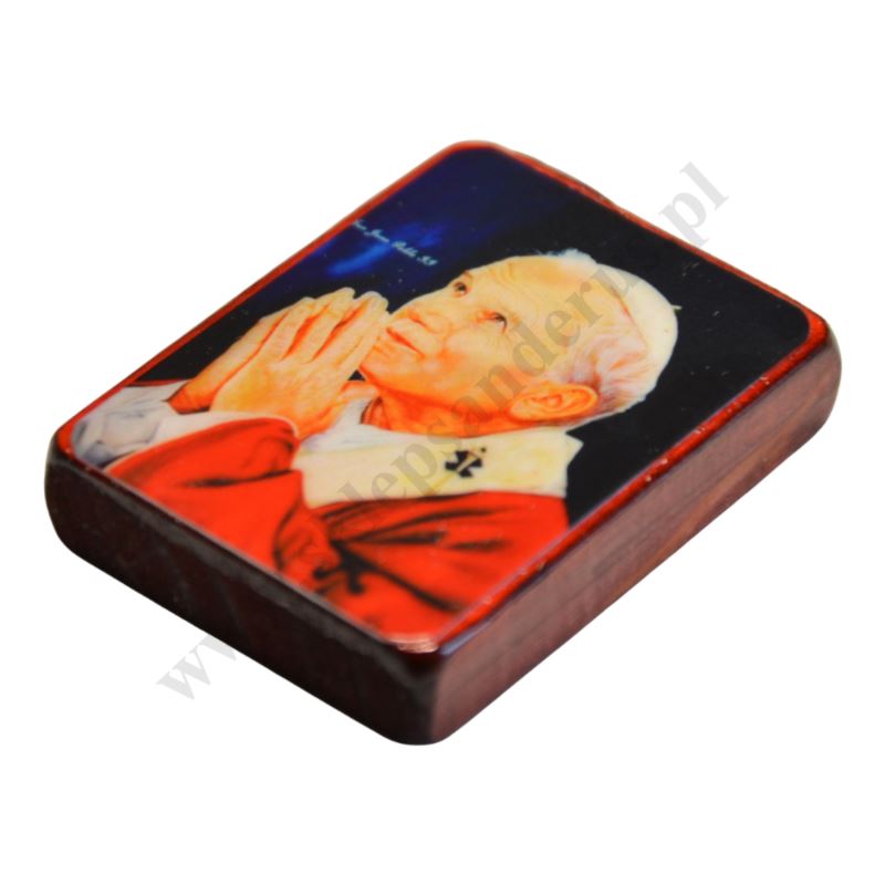 Magnes na drewienku w formacie 3.8 x 5 cm przedstawiający wizerunek Św. Jana Pawła II.