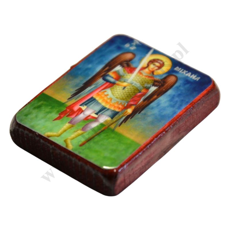 Magnes na drewienku w formacie 3.8 x 5 cm przedstawiający wizerunek Św. Michała Archanioła.
