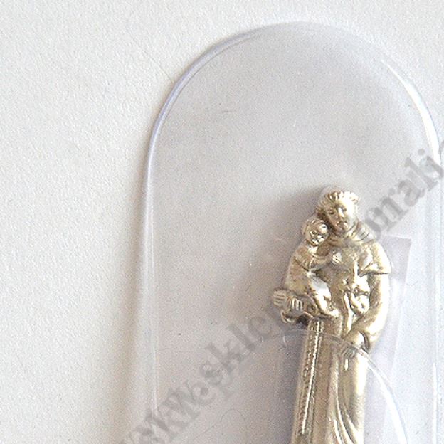 Metalowa figurka Świętego Antoniego o wysokości 3 cm w przezroczystym etui.