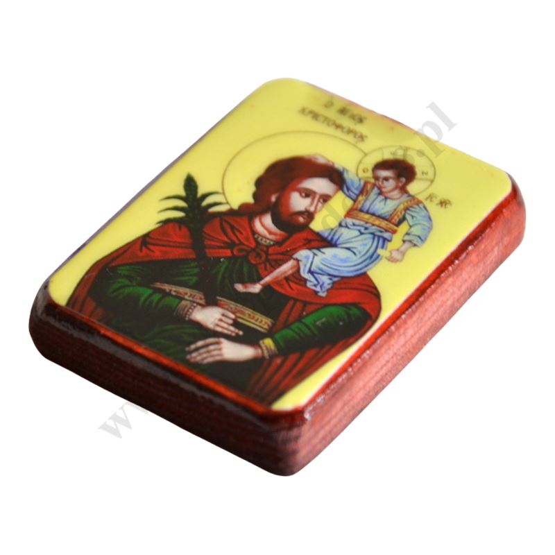 Magnes na drewienku w formacie 3.8 x 5 cm przedstawiający wizerunek Świętego Krzysztofa.