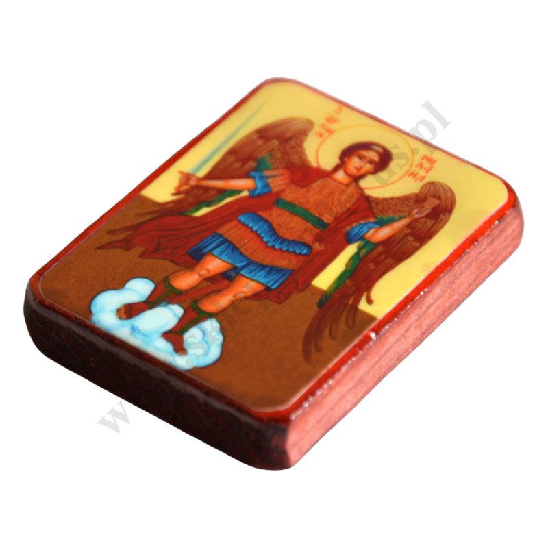 Magnes na drewienku w formacie 3.8 x 5 cm przedstawiający wizerunek Świętego Michała Archanioła.