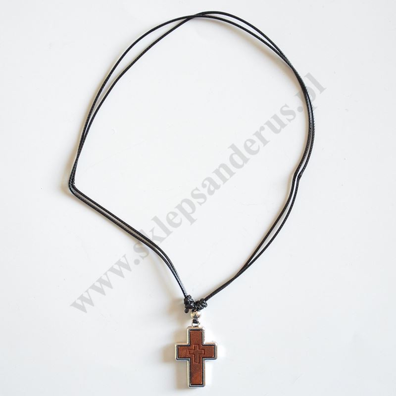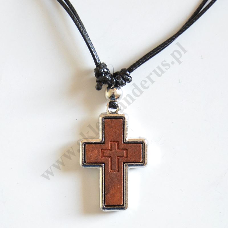 Metalowy krzyżyk z drewnianą wkładką na czarnej, grubszeh lince. Wysokość krzyżyka 3 cm, szerokość krzyżyka 2 cm.