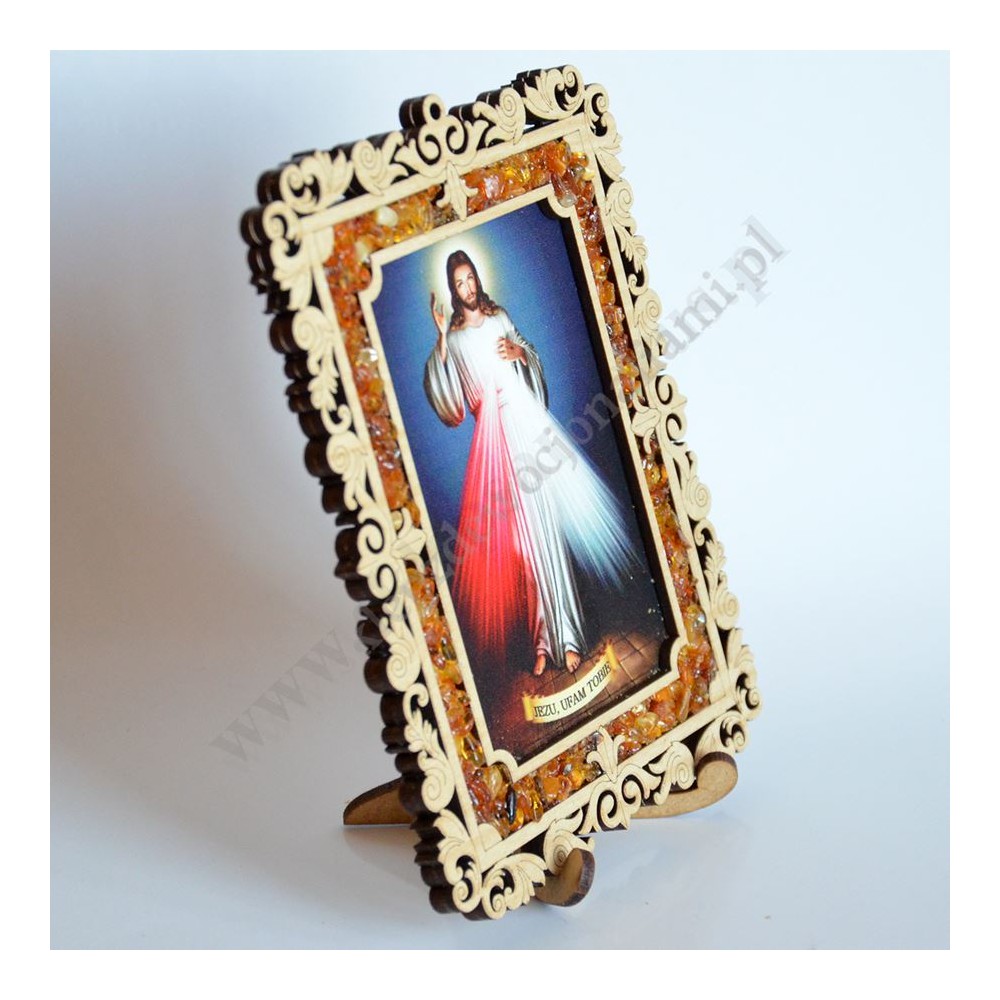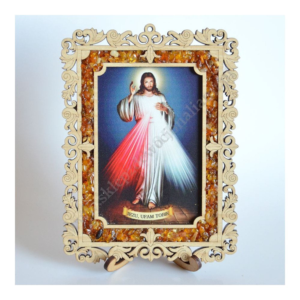 Obrazek Jezu Ufam Tobie wykonany w sklejce ze stojaczkiem, zdobiony dodatkowo sztucznym bursztynem, obrazek również można powiesić. Rozmiat 11 x 14.5 cm.