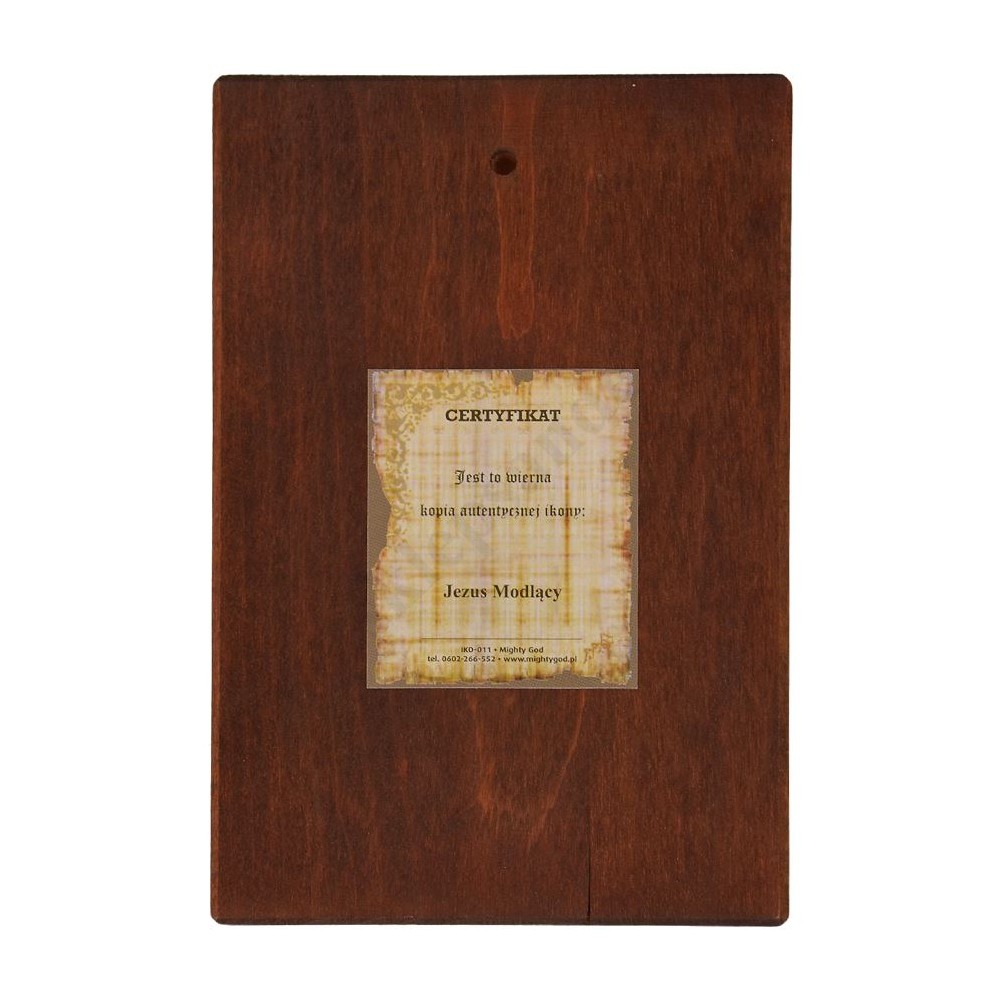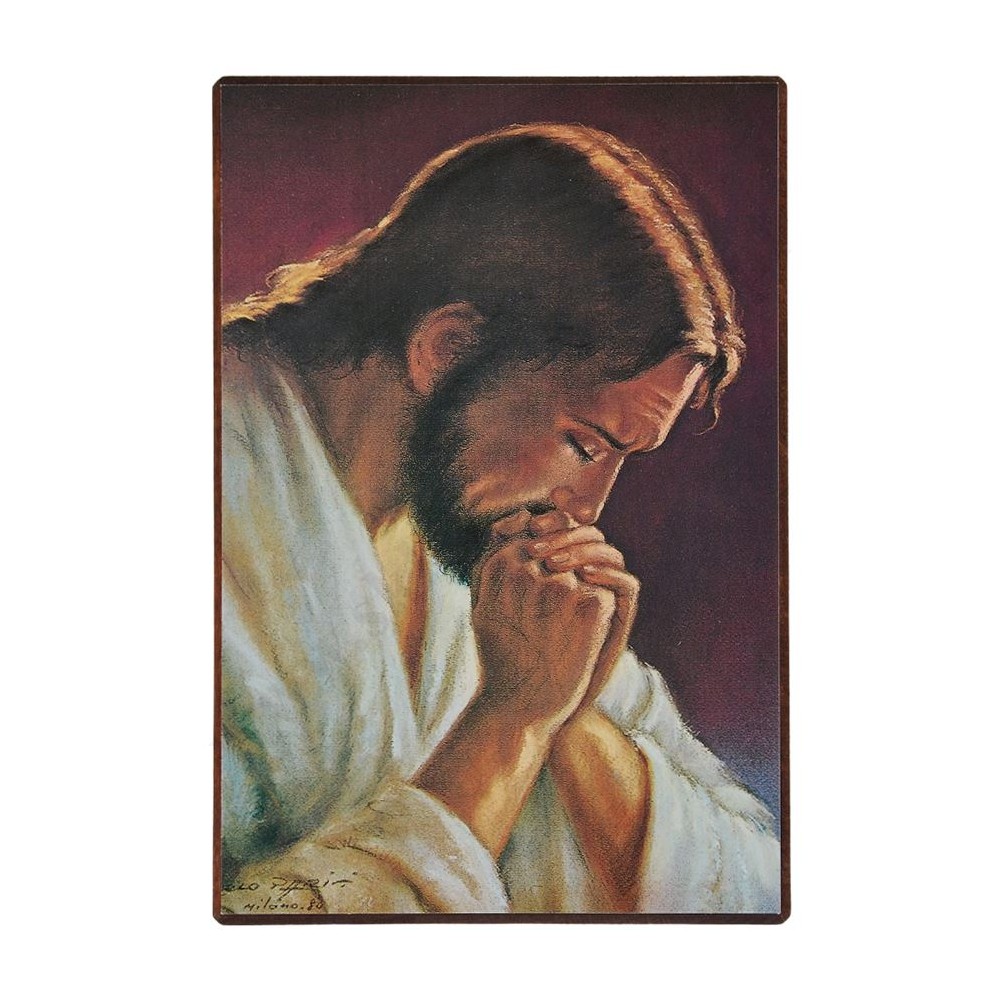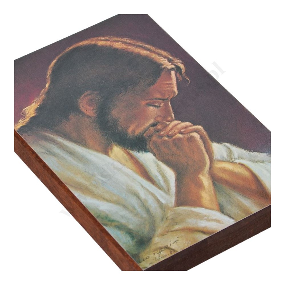 Obrazek Pana Jezusa modlącego naklejany na drewnianej desce w formacie 11 x 16 cm.