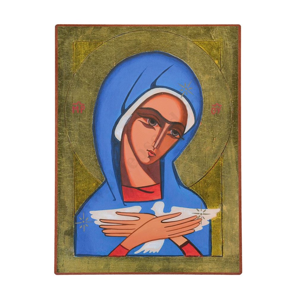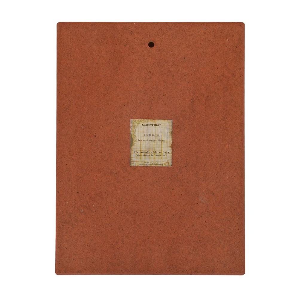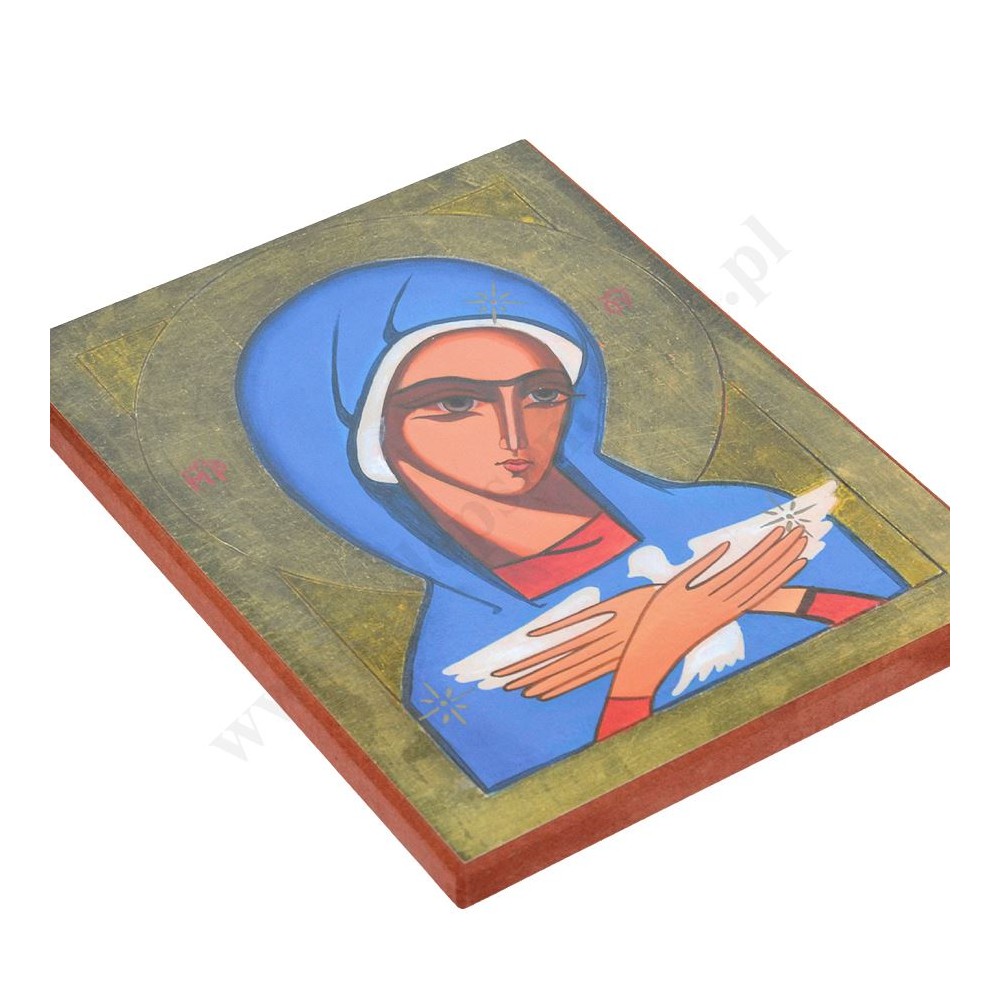 Obrazek Matki Bożej niosącej Ducha Świętego naklejany na drewnianej desce w formacie 19 x 25.5 cm.