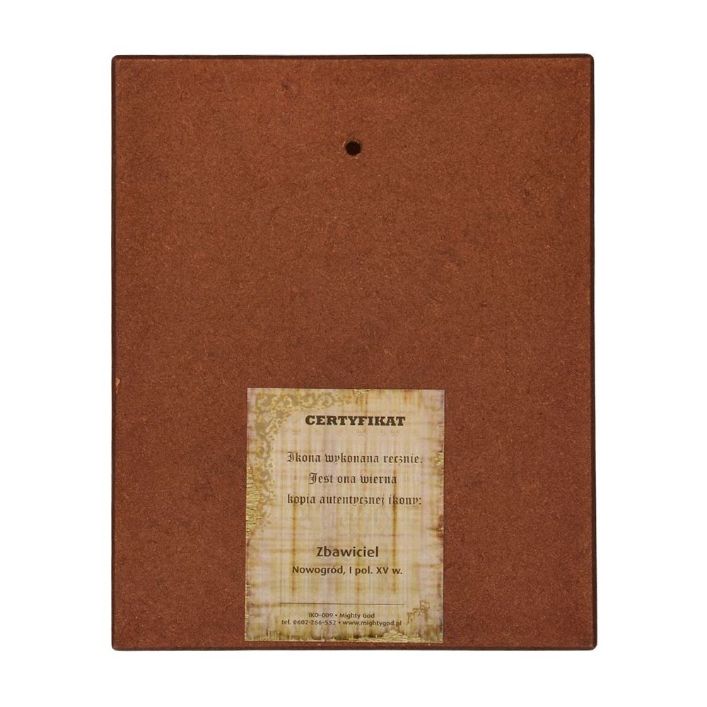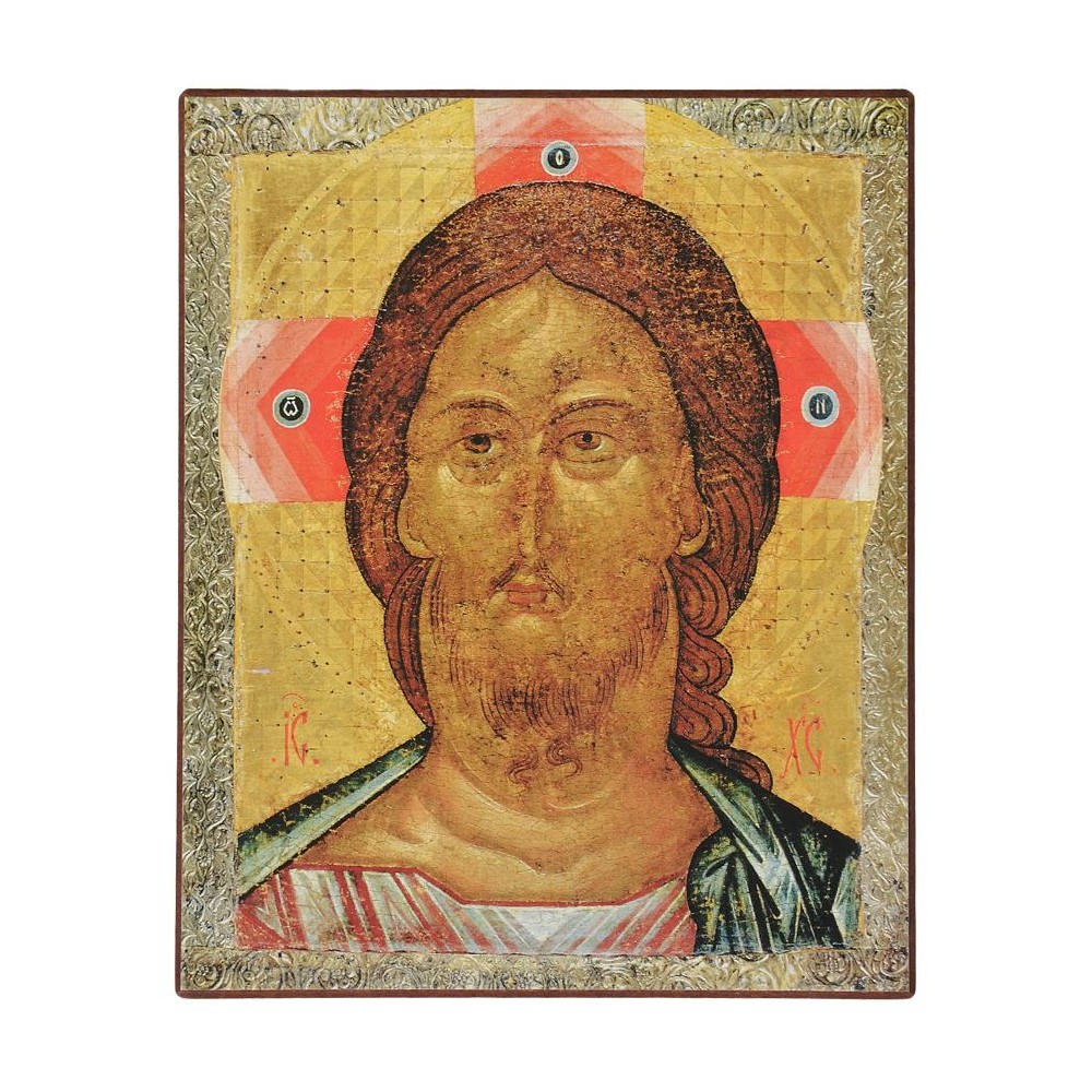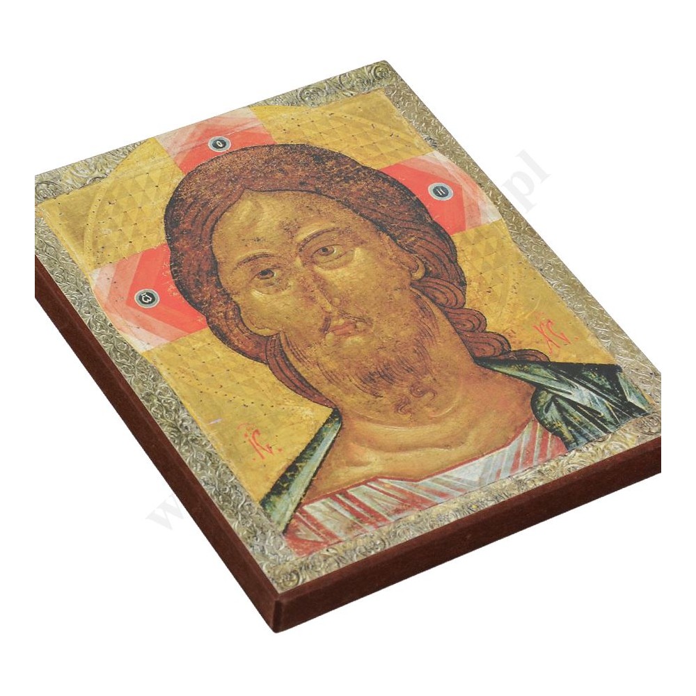 Obrazek przedstawiający Pana Jezusa Zbawiciela naklejany na drewnianej desce w formacie 14.3 x 17.6 cm.