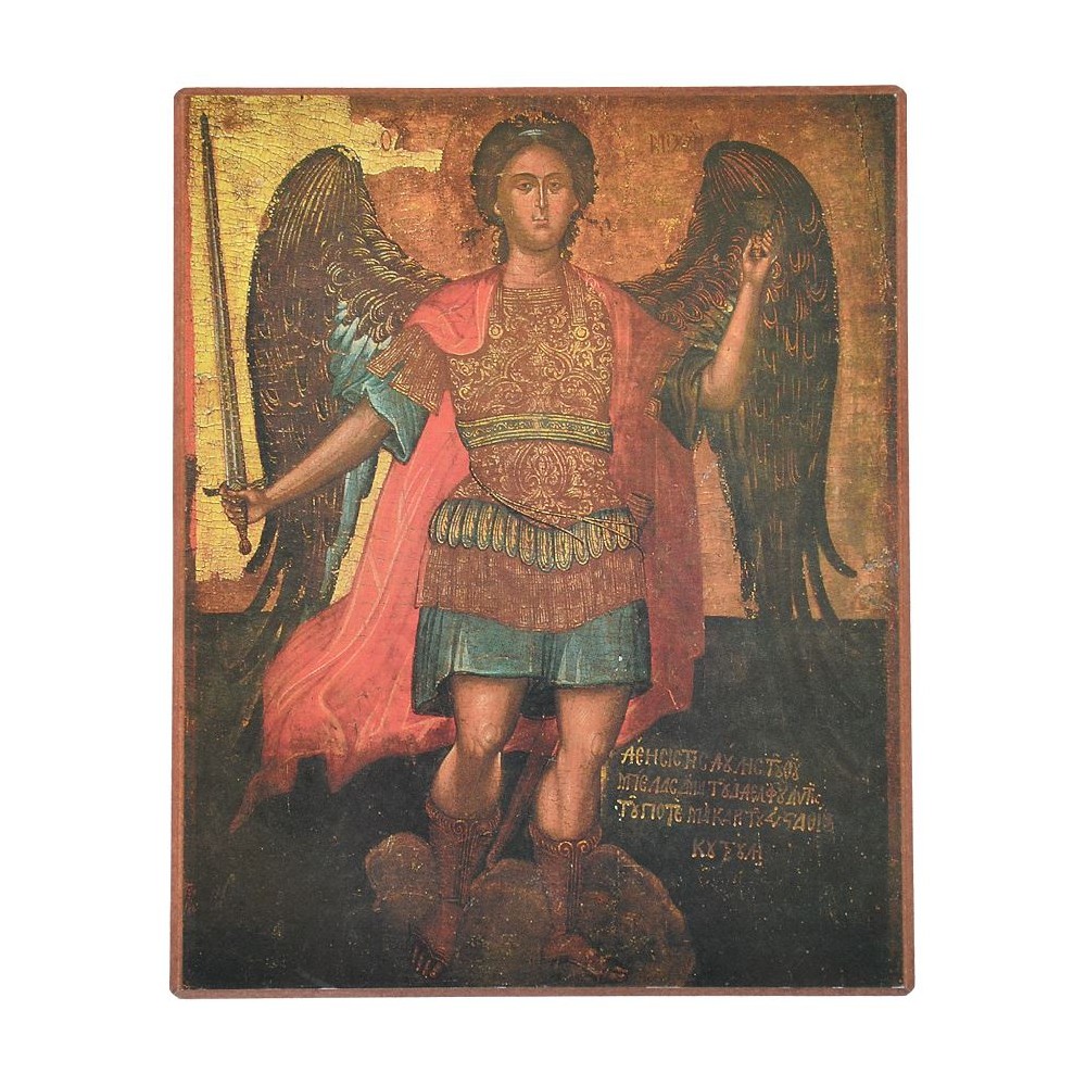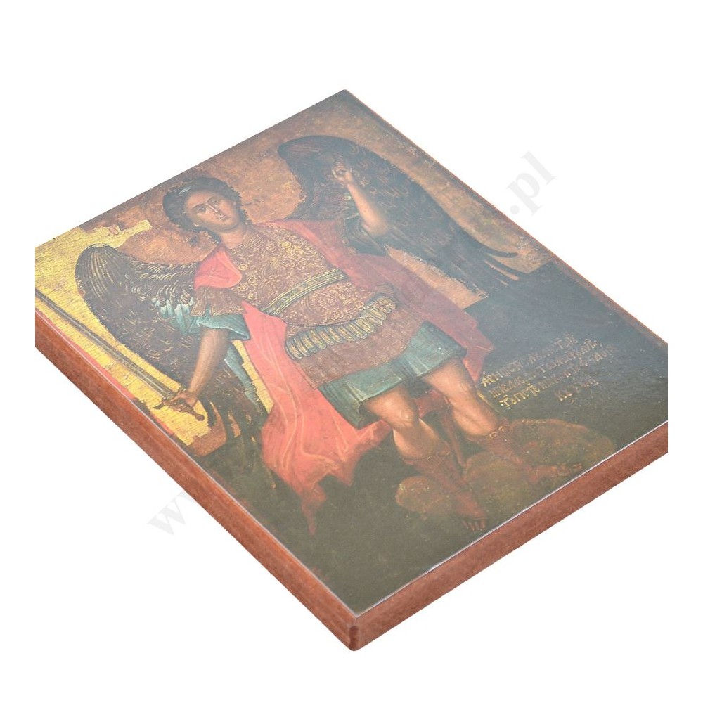 Obrazek Świętego Michała Archanioła naklejany na drewnianej desce w formacie 16.5 x 20.5 cm.