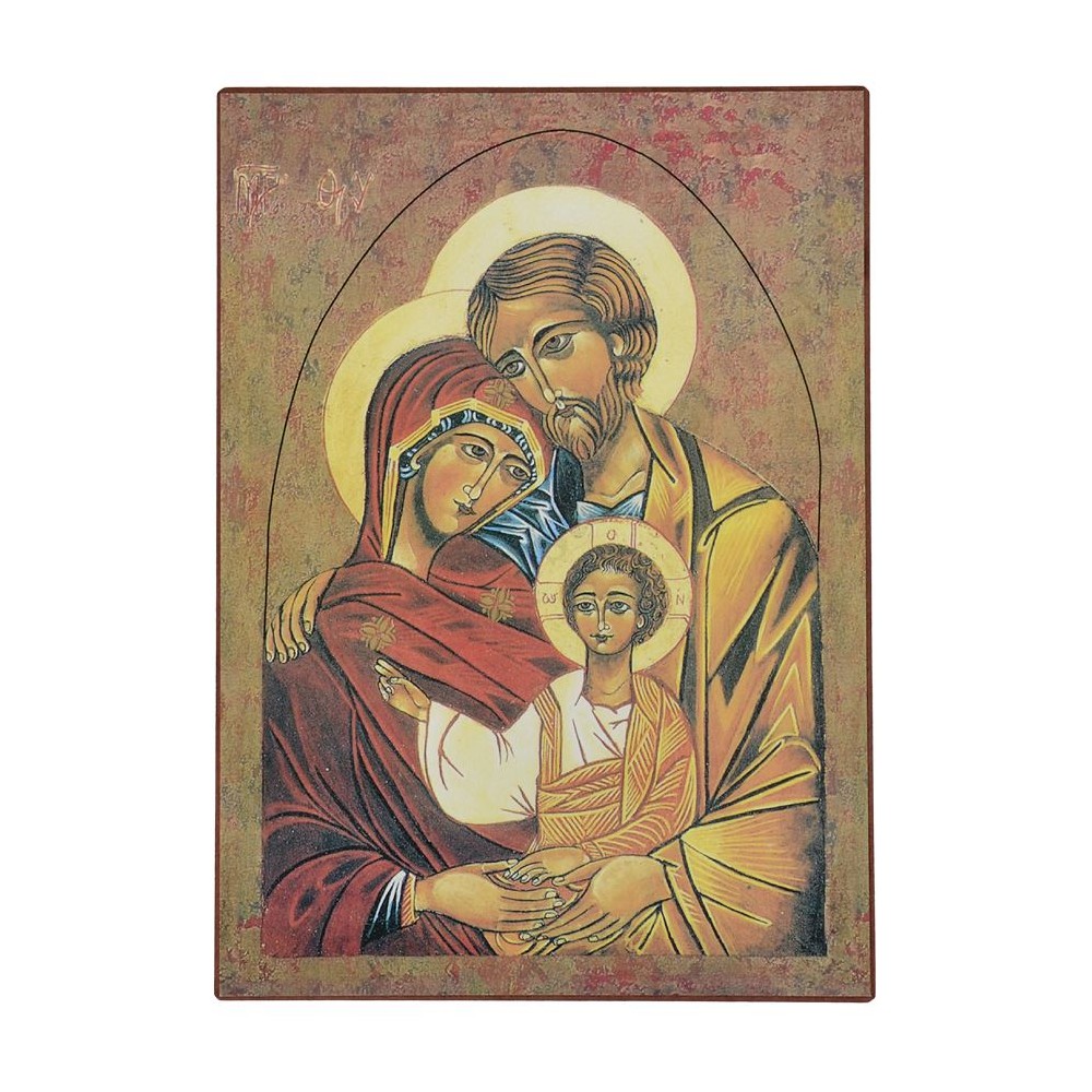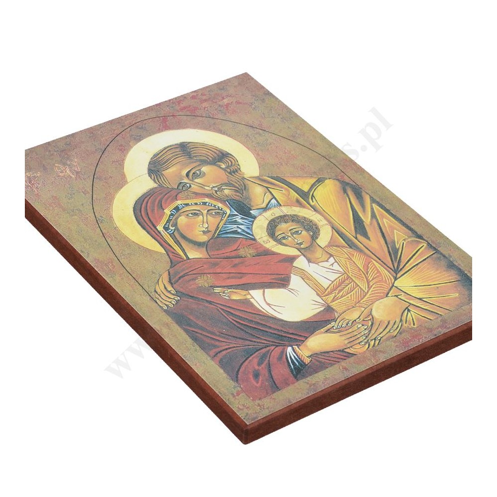 Obrazek przedstawiający Świętą Rodzinę naklejany na drewnianej desce w formacie 20.5 x 28.5 cm.