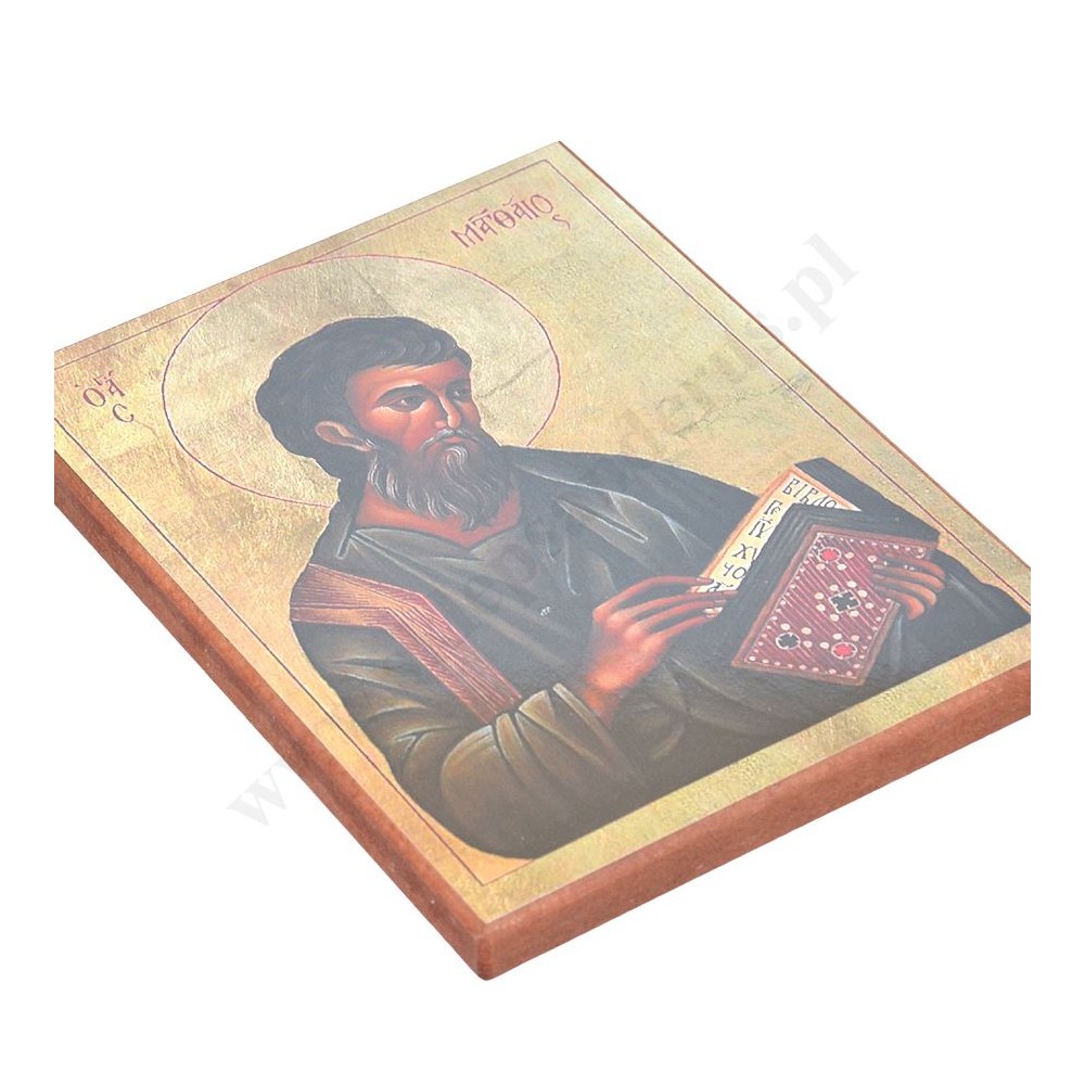 Obrazek Świętego Mateusza naklejany na drewnianej desce w formacie 15.5 x 20.5 cm.