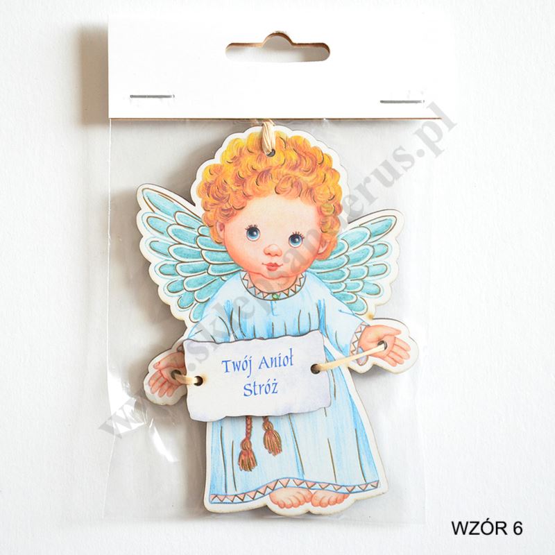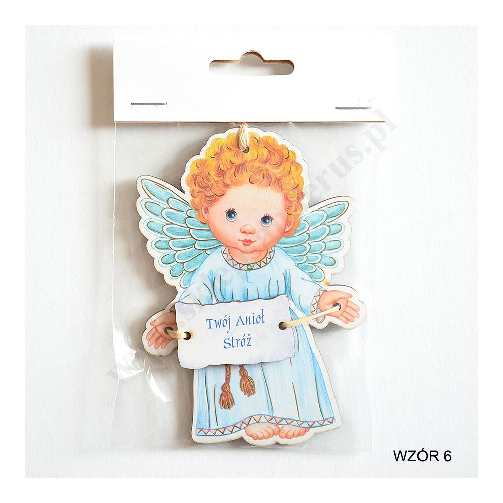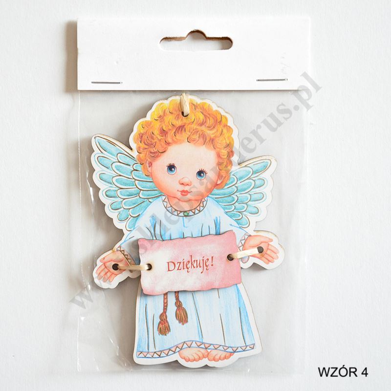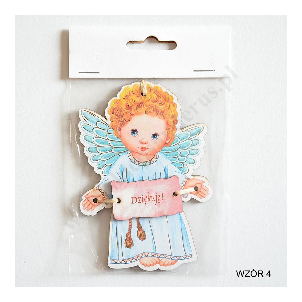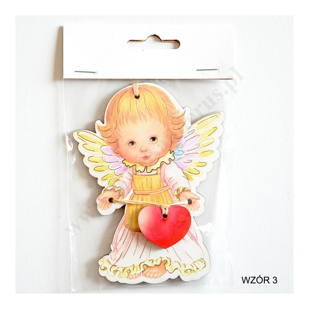 Zawieszka aniołek na płycie mdf o wysokości 11.3 cm i szerokość 8.5 cm, sprzedaż w miksie wzorów.
