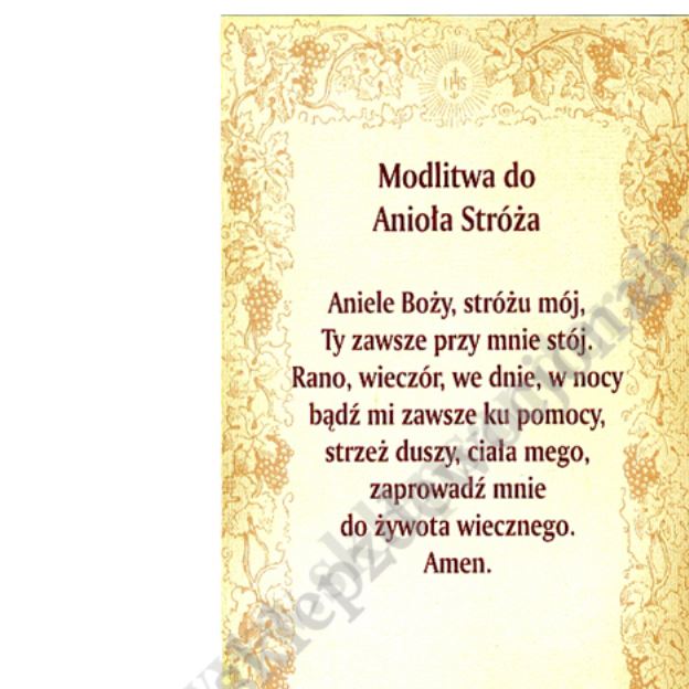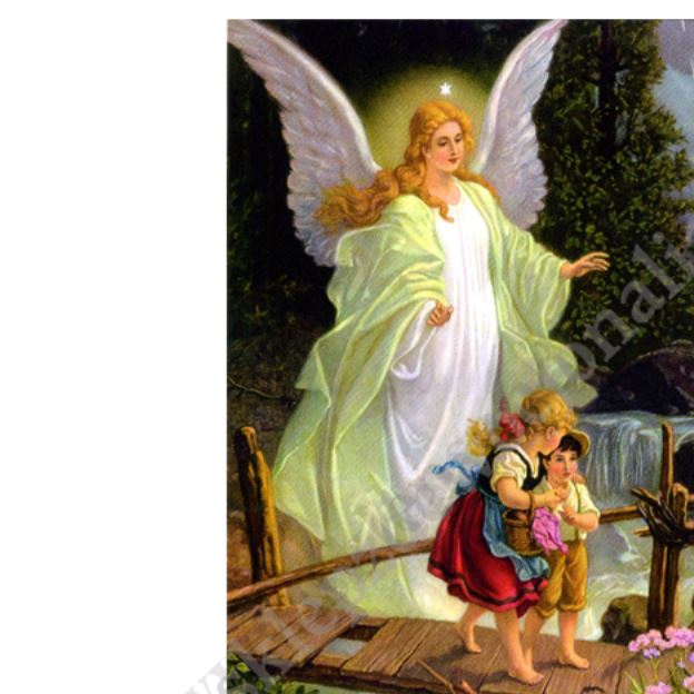 Obrazek z wizerunkiem Anioła Stróża, lakierowany w formacie 7 x 13 cm z tekstem modlitwy do Anioła Stróża na rewersie. Sprzedaż w paczce po 100 szt.