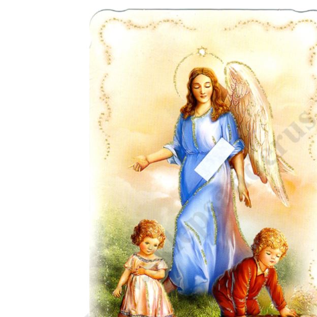 Obrazek przedstawiający Anioła Stróża z dziećmi, brokatowany w formacie 9 x 14.8 cm z tekstem modlitwy do Anioła Stróża na rewersie. Sprzedaż w paczce po 100 szt.