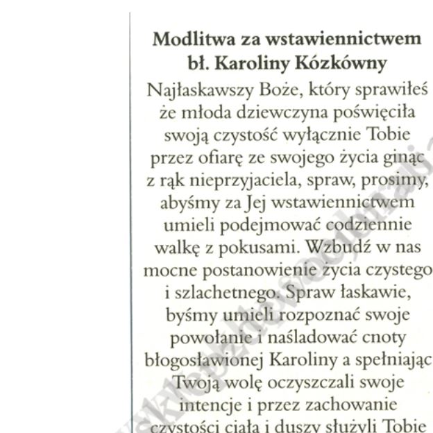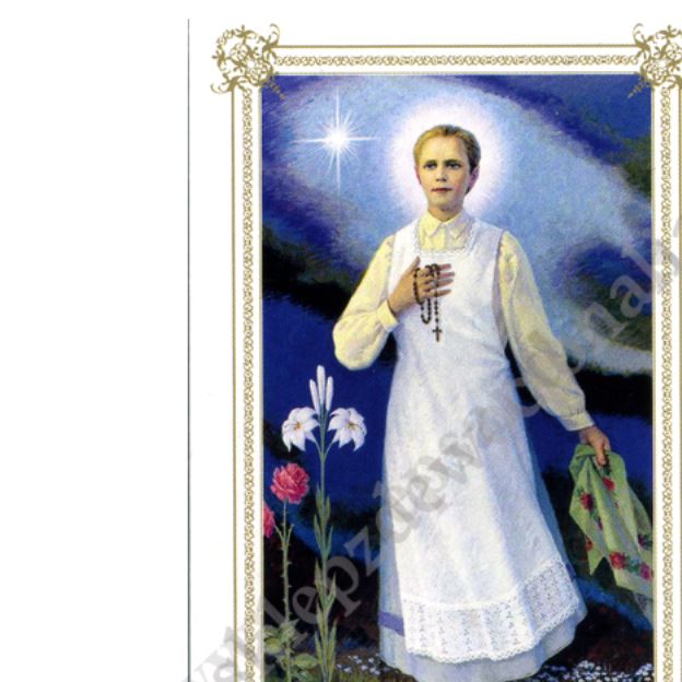 Obrazki z wizerunkiem Błogosławionej Karoliny w formcie 6.5 x 11 cm, lakierowane, pakowane po 100 szt. na rewersie modlitwa za wstawiennictwem Błogosławionej Karoliny.