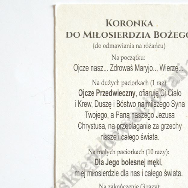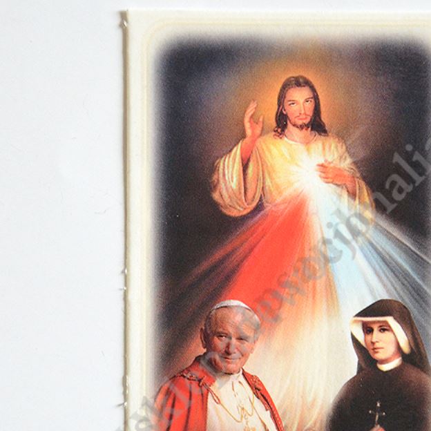 Obrazki z wizerunkiem Jezu Ufam Tobie oraz Świętym Janem Pawłem II oraz Świętą Faustyną w formcie 6.5 x 11 cm pakowane po 100 szt. na rewersie obrazka koronka do Miłosierdzia Bożego.