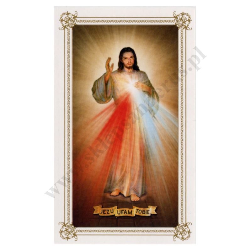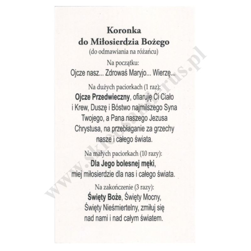 Obrazek z wizerunkiem Jezusa Miłosiernego w formacie 6.5 x 11 cm, na rewersie Koronka do Miłosierdzia Bożego. Sprzedaż w paczkach po 100 szt.