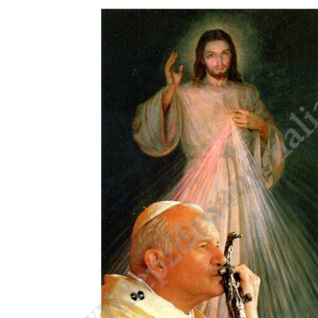 Obrazek z wizerunkiem Jezu Ufam Tobie oraz Świętego Jana Pawła II, lakierowany w formacie 7 x 13 cm z Koronką do Miłosierdzia Bożego na rewersie. Sprzedaż w paczce po 100 szt.