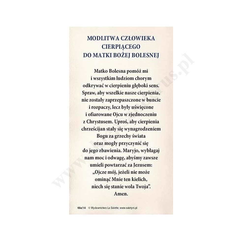 Obrazek z wizerunkiem Matki Bożej Bolesnej, lakierowany w formacie 7 x 13 cm z modlitwą chorego na rewersie. Sprzedaż w paczce po 100 szt.