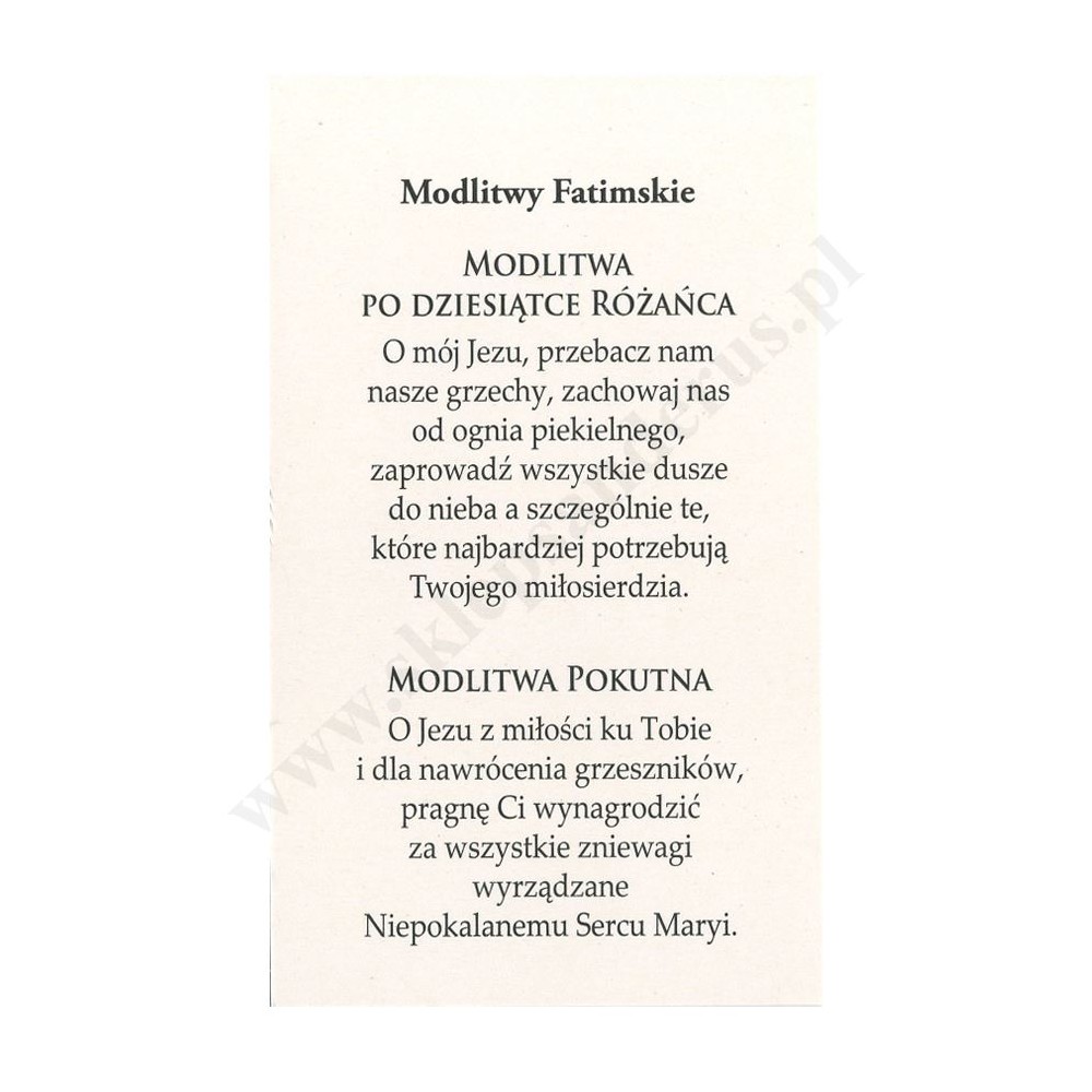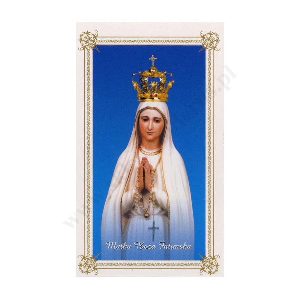 Obrazek z wizerunkiem Matki Bożej Fatimskiej w formacie 6.5 x 11 cm, na rewersie obrazka Modlitwy Fatimskie. Sprzedaż w paczce po 100 szt.
