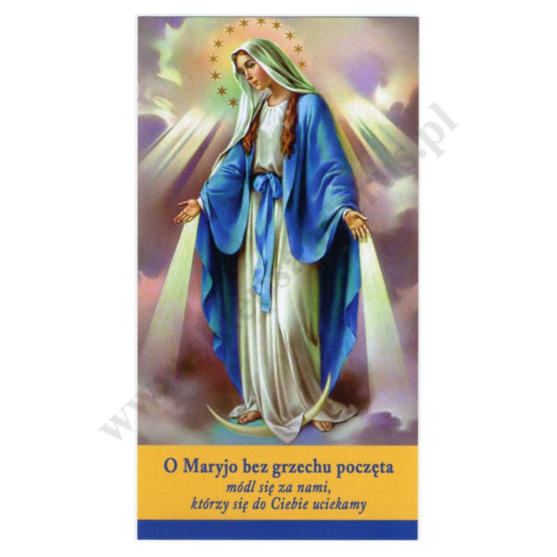 Obrazek z wizerunkiem Matki Bożej Niepokalanej, lakierowany w formacie 7 x 13 cm, czysty na rewersie. Sprzedaż w paczce po 100 szt.