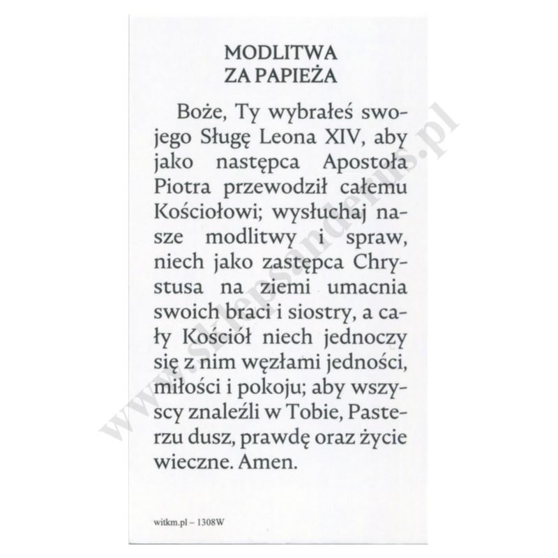 Obrazek z wizerunkiem Papieża Leona XIV, lakierowany w formacie 6.7 x 11.8 cm, na rewersie obrazka modlitwa za papieża. Sprzedaż w paczce po 100 szt.