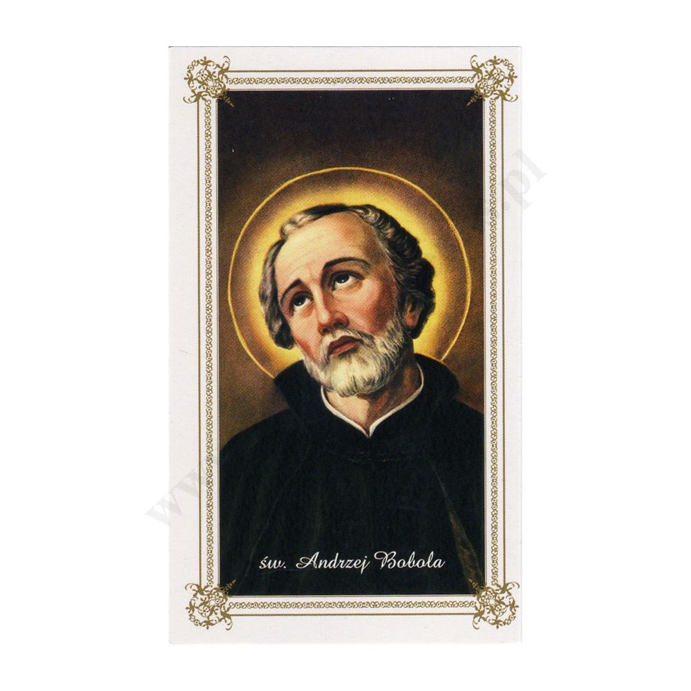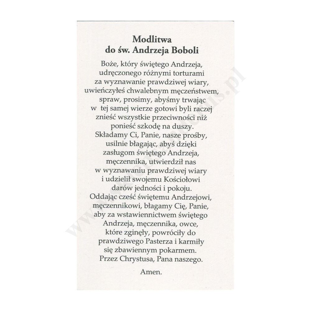 Obrazek przedstawiający wizerunek Świętego Andrzeja Boboli, lakierowany UV w formacie 6.5 x 11 cm z tekstem modlitwy do św. Adrzeja Boboli na rewersie. Sprzedaż w paczce po 100 szt.