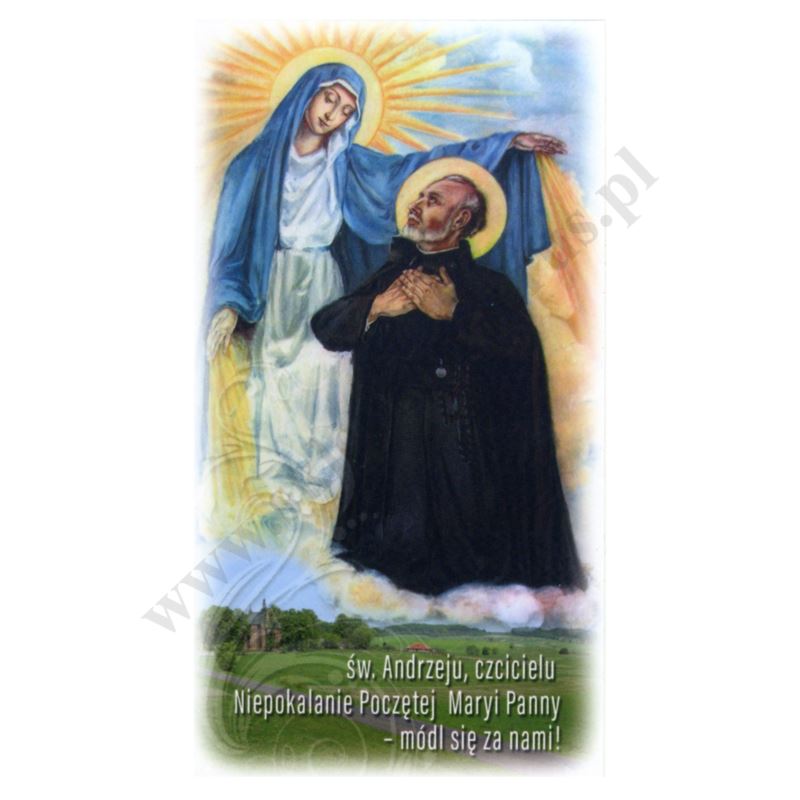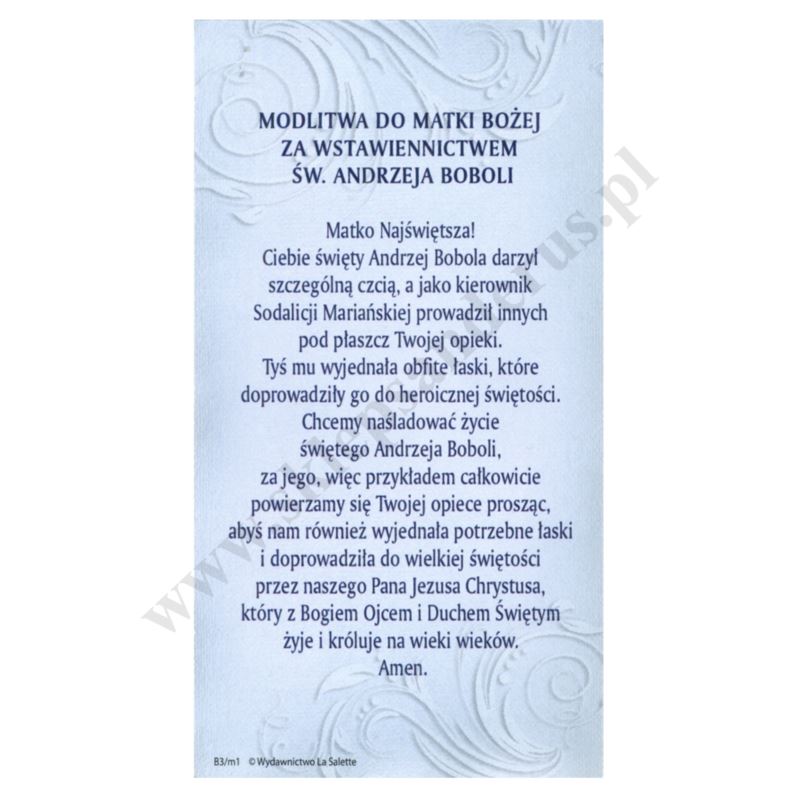 Obrazek z wizerunkiem Świetego Andrzeja Boboli, lakierowany w formacie 7 x 13 cm, na rewersie obrazka modlitwa do Matki Bożej za wstawiennictwem Św. Andrzeja Boboli. Sprzedaż w paczce po 100 szt.