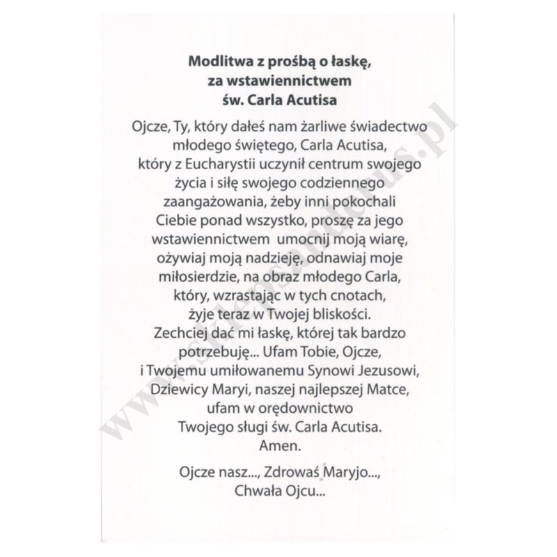 Obrazek św. Carlo Acutisa, lakierowany w formacie pocztówkowym 10 x 15 cm, na rewersie modlitwa za wstawiennictwem świętego. Sprzedaż w paczce po 100 szt.