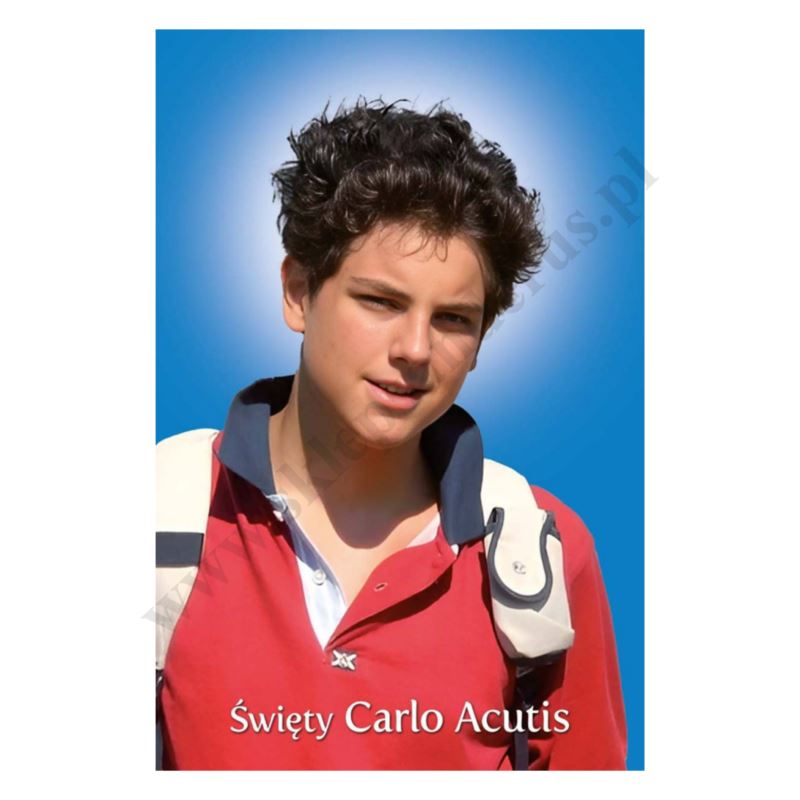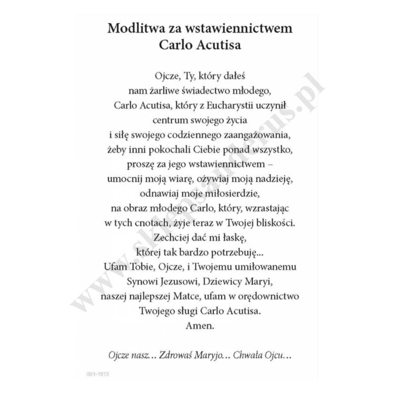 Obrazki Świętego Carlo Acutisa w formacie 6.5 x 10 cm z modlitwą za wstawiennictwem świętego. Sprzedaż w paczce po 100 szt.