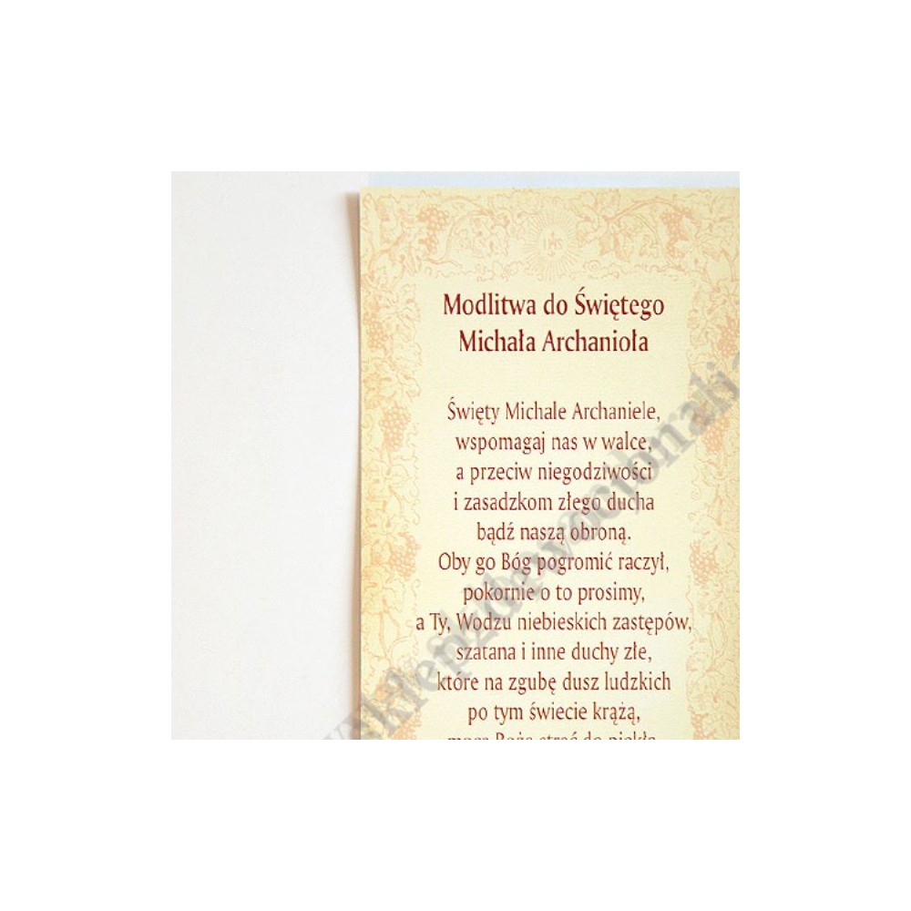 Obrazki Świętego Michała Archanioła w formcie 7 x 13 cm pakowane po 100 szt. na rerwersie obrazka modlitwa do Świętego Michała Archanioła.