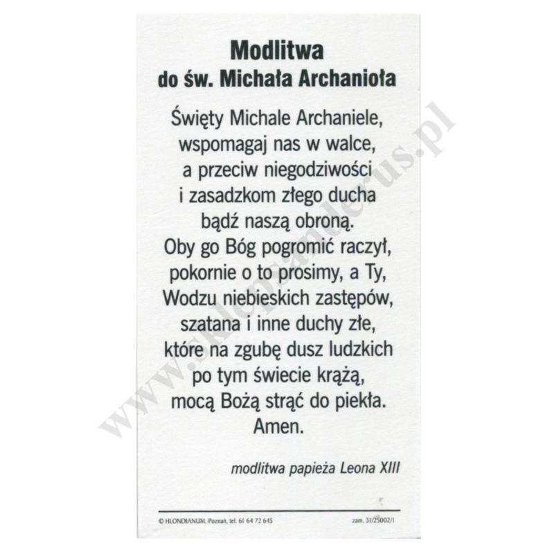 Obrazek św. Michała Archanioła, lakierowany w formacie 7 x 13 cm, na rewersie tekst modlitwy do św. Michała Archanioła. Sprzedaż w paczce po 25 szt.